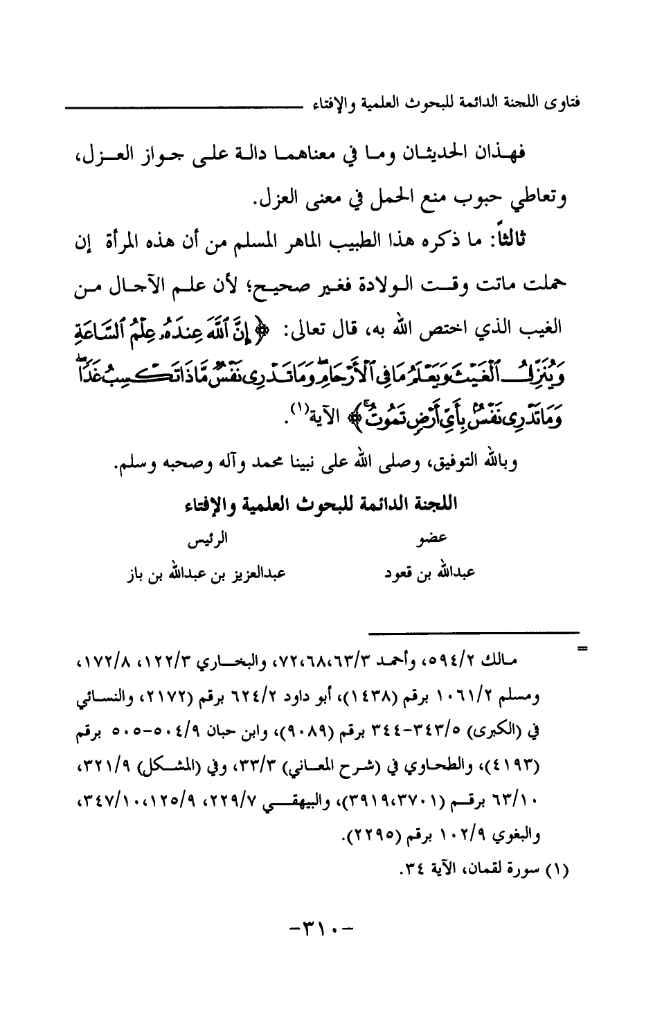 فهذان الحديثان وما في معناهما دالة على جواز العزل، وتعاطي حبوب منع الحمل في معنى العزل. ثالثا: ما ذكره هذا الطبيب الماهر المسلم من أن هذه المرأة إن حملت ماتت وقت الولادة فغير صحيح؛ لأن علم الآجال من الغيب الذي اختص الله به، قال تعالى: {إِنَّ اللَّهَ عِنْدَهُ عِلْمُ السَّاعَةِ وَيُنَزِّلُ الْغَيْثَ وَيَعْلَمُ مَا فِي الْأَرْحَامِ وَمَا تَدْرِي نَفْسٌ مَاذَا تَكْسِبُ غَدًا وَمَا تَدْرِي نَفْسٌ بِأَيِّ أَرْضٍ تَمُوتُ} (¬1) وبالله التوفيق، وصلى الله على نبينا محمد وآله وصحبه وسلم.