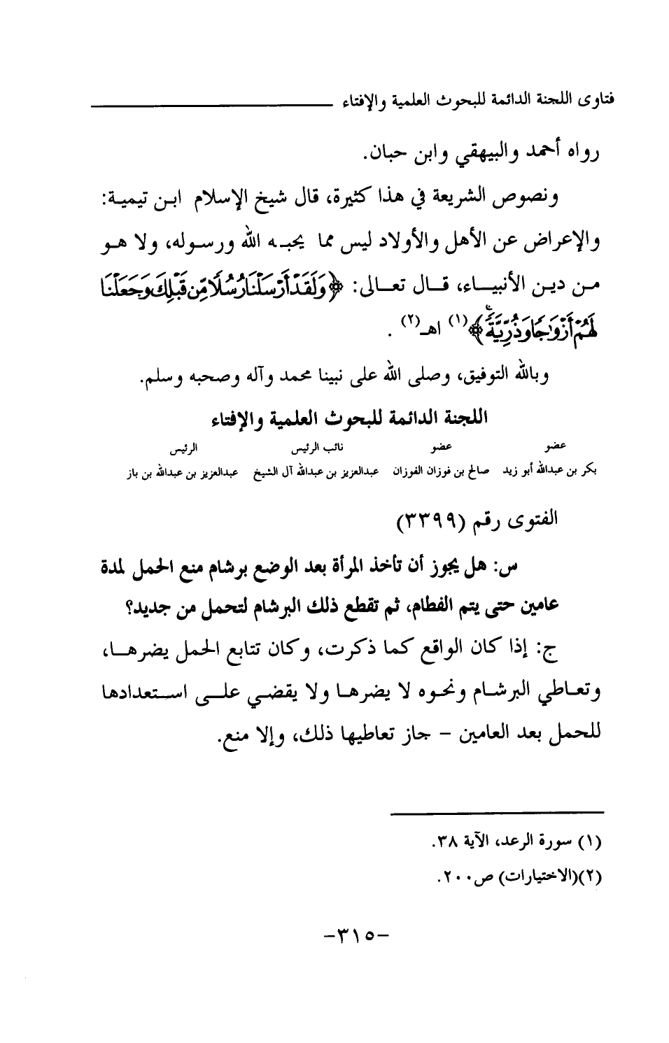 رواه أحمد والبيهقي وابن حبان. ونصوص الشريعة في هذا كثيرة، قال شيخ الإسلام ابن تيمية والإعراض عن الأهل والأولاد ليس مما يحبه الله ورسوله، ولا هو من دين الأنبياء، قال تعالى: {وَلَقَدْ أَرْسَلْنَا رُسُلًا مِنْ قَبْلِكَ وَجَعَلْنَا لَهُمْ أَزْوَاجًا وَذُرِّيَّةً} (¬1) اهـ. (¬2) وبالله التوفيق، وصلى الله على نبينا محمد وآله وصحبه وسلم.