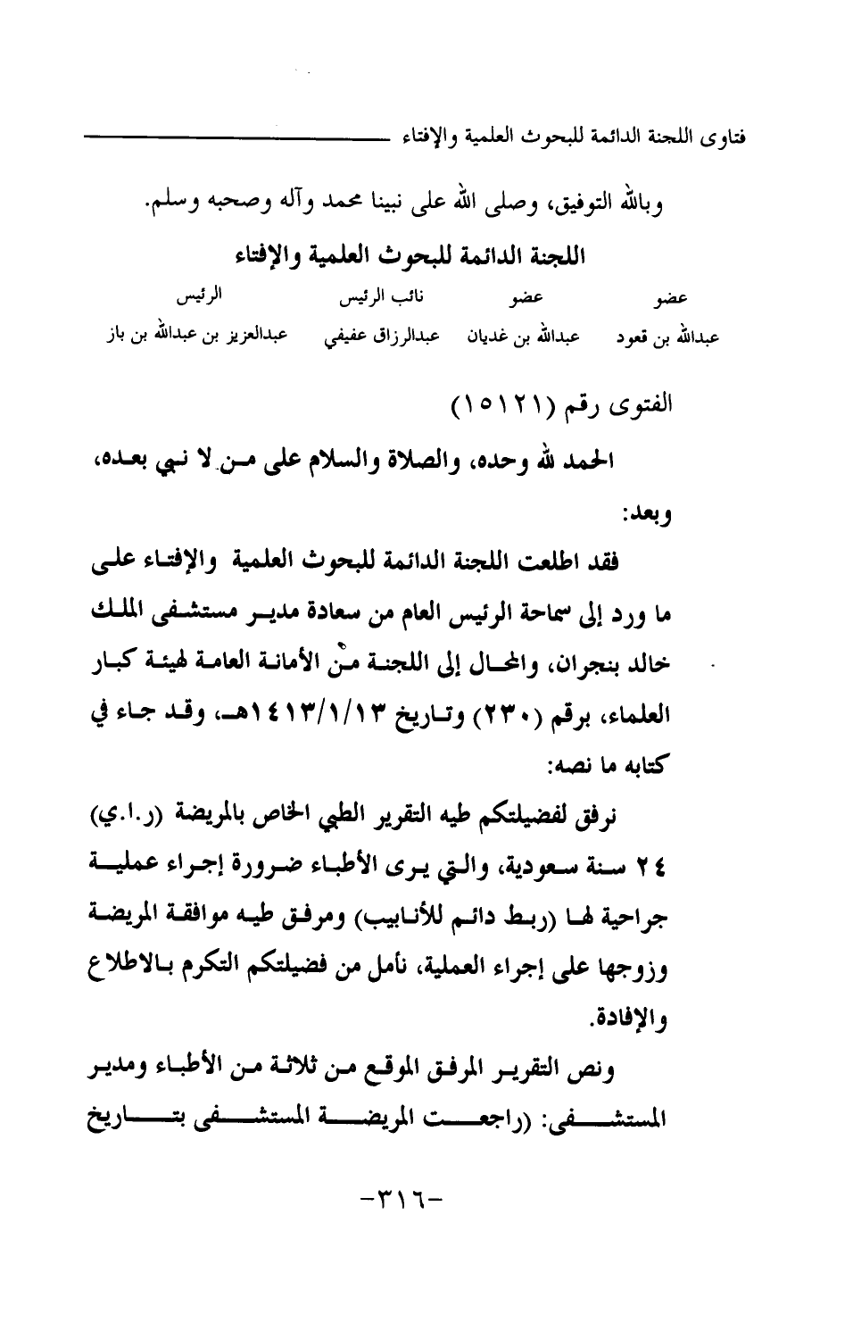 فقد اطلعت اللجنة الدائمة للبحوث العلمية والإفتاء على ما ورد إلى سماحة الرئيس العام من سعادة مدير مستشفى الملك خالد بنجران، والمحال إلى اللجنة من الأمانة العامة لهيئة كبار العلماء، برقم (230) وتاريخ 13 \ 1 \ 1413 هـ، وقد جاء في كتابه ما نصه: