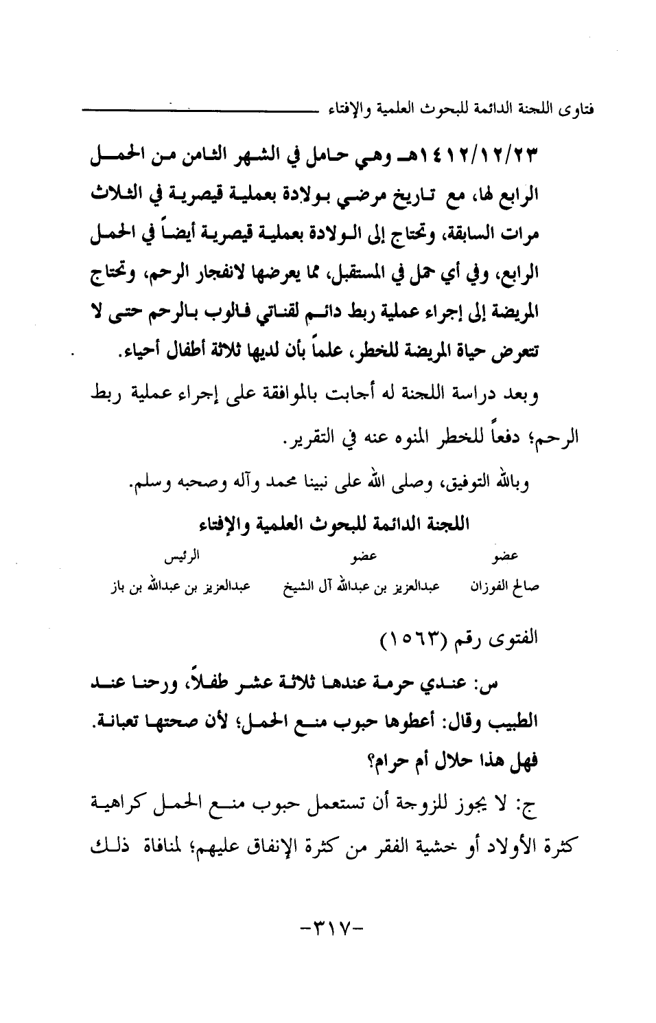 وبعد دراسة اللجنة له أجابت: بالموافقة على إجراء عملية ربط الرحم؛ دفعا للخطر المنوه عنه في التقرير. وبالله التوفيق، وصلى الله على نبينا محمد وآله وصحبه وسلم.