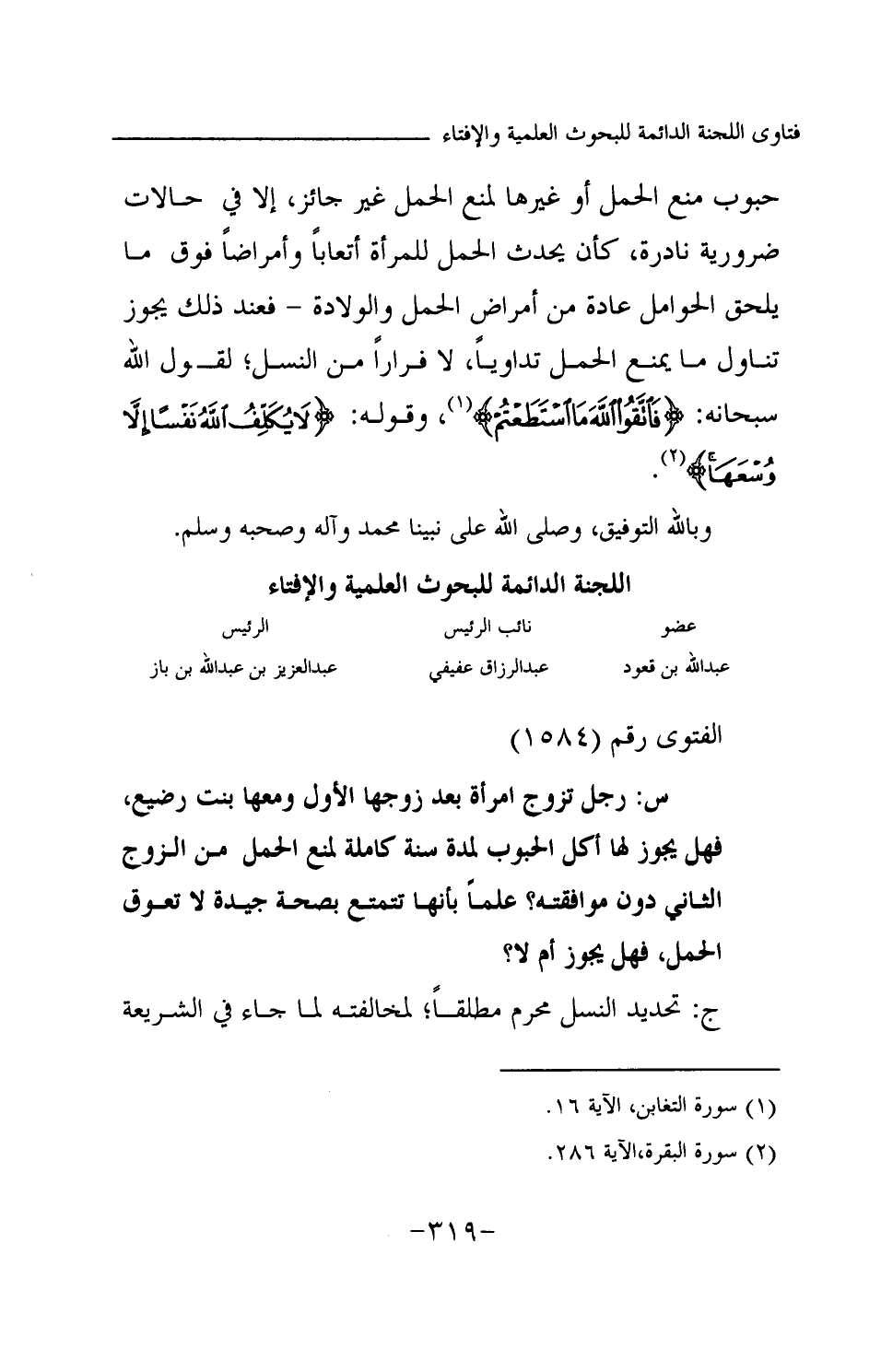 حبوب منع الحمل أو غيرها لمنع الحمل غير جائز، إلا في حالات ضرورية نادرة، كأن يحدث الحمل للمرأة أتعابا وأمراضا فوق ما يلحق الحوامل عادة من أمراض الحمل والولادة- فعند ذلك يجوز تناول ما يمنع الحمل تداويا، لا فرارا من النسل؛ لقول الله -سبحانه-: {فَاتَّقُوا اللَّهَ مَا اسْتَطَعْتُمْ} (¬1) وقوله: {لَا يُكَلِّفُ اللَّهُ نَفْسًا إِلَّا وُسْعَهَا} (¬2) وبالله التوفيق، وصلى الله على نبينا محمد وآله وصحبه وسلم.