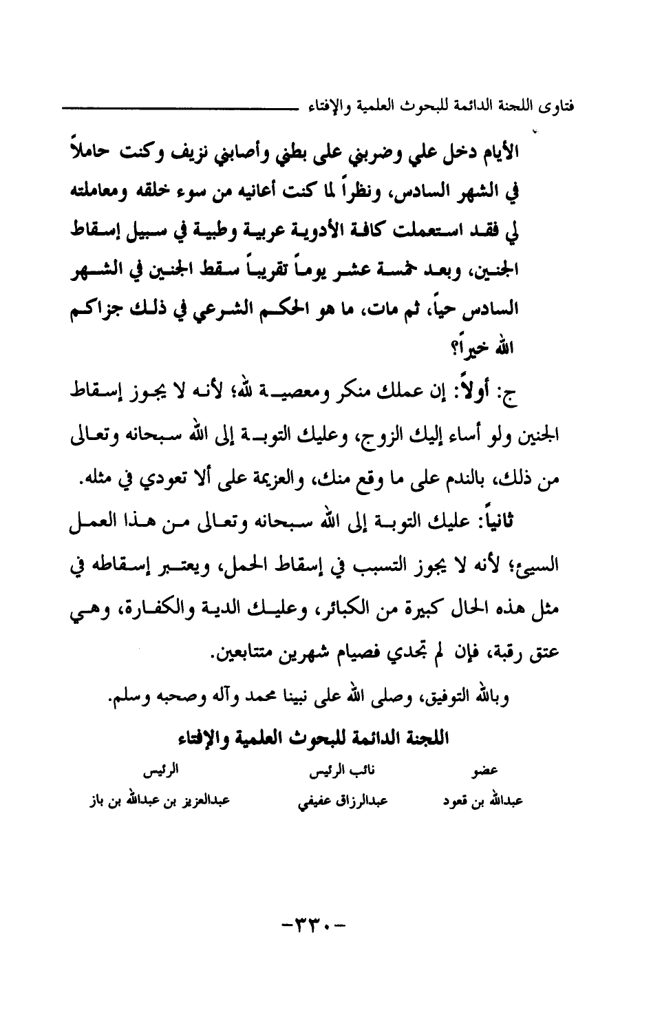 ج: أولا: إن عملك منكر ومعصية لله؛ لأنه لا يجوز إسقاط الجنين ولو أساء إليك الزوج، وعليك التوبة إلى الله سبحانه وتعالى من ذلك، بالندم على ما وقع منك، والعزيمة على ألا تعودي في مثله. ثانيا: عليك التوبة إلى الله سبحانه وتعالى من هذا العمل السيئ؛ لأنه لا يجوز التسبب في إسقاط الحمل، ويعتبر إسقاطه في مثل هذه الحال كبيرة من الكبائر، وعليك الدية والكفارة، وهي عتق رقبة، فإن لم تجدي فصيام شهرين متتابعين. وبالله التوفيق، وصلى الله على نبينا محمد وآله وصحبه وسلم.