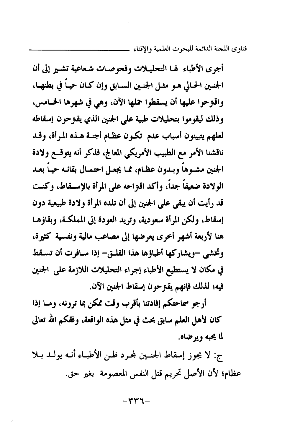أجرى الأطباء لها التحليلات وفحوصات شعاعية تشير إلى أن الجنين الحالي هو مثل الجنين السابق وإن كان حيا في بطنها، واقترحوا عليها أن يسقطوا حملها الآن، وهي في شهرها الخامس، وذلك ليقوموا بتحليلات طبية على الجنين الذي يقترحون إسقاطه لعلهم يتبينون أسباب عدم تكون عظام أجنة هذه المرأة، وقد ناقشنا الأمر مع الطبيب الأمريكي المعالج، فذكر أنه يتوقع ولادة الجنين مشوها وبدون عظام، مما يجعل احتمال بقائه حيا بعد الولادة ضعيفا جدا، وأكد اقتراحه على المرأة بالإسقاط، وكنت قد رأيت أن يبقى على الجنين إلى أن تلده المرأة ولادة طبيعية دون إسقاط، ولكن المرأة سعودية، وتريد العودة إلى المملكة، وبقاؤها هنا لأربعة أشهر أخرى يعرضها إلى مصاعب مالية ونفسية كثيرة، وتخشى- ويشاركها أطباؤها هذا القلق- إذا سافرت أن تسقط في مكان لا يستطيع الأطباء إجراء التحليلات اللازمة على الجنين فيه؛ لذلك فإنهم يقترحون إسقاط الجنين الآن. أرجو سماحتكم إفادتنا بأقرب وقت ممكن بما ترونه، وما إذا كان لأهل العلم سابق بحث في مثل هذه الواقعة، وفقكم الله تعالى لما يحبه ويرضاه.
