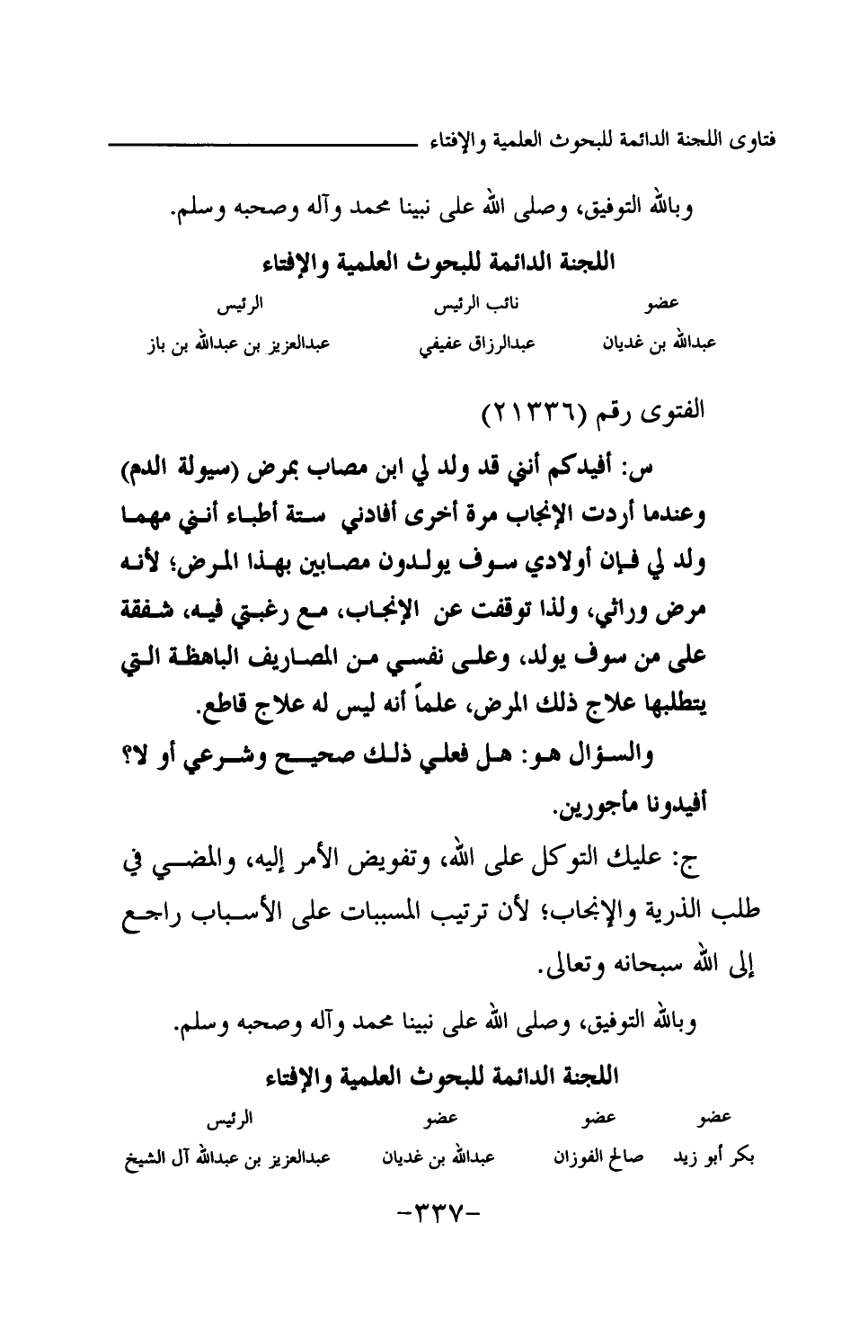ج: عليك التوكل على الله، وتفويض الأمر إليه، والمضي في طلب الذرية والإنجاب؛ لأن ترتيب المسببات على الأسباب راجع إلى الله سبحانه وتعالى. وبالله التوفيق، وصلى الله على نبينا محمد وآله وصحبه وسلم.