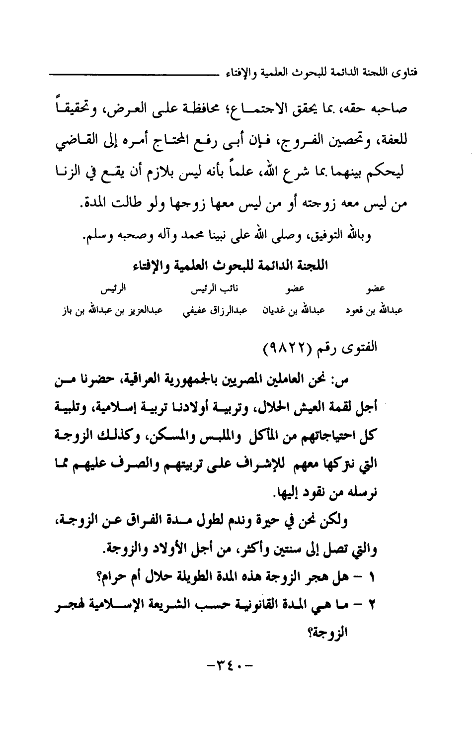 صاحبه حقه، مما يحقق الاجتماع؛ محافظة على العرض، وتحقيقا للعفة، وتحصين الفروج، فإن أبى رفع المحتاج أمره إلى القاضي ليحكم بينهما بما شرع الله، علما بأنه ليس بلازم أن يقع في الزنا من ليس معه زوجته أو من ليس معها زوجها ولو طالت المدة. وبالله التوفيق، وصلى الله على نبينا محمد وآله وصحبه وسلم.