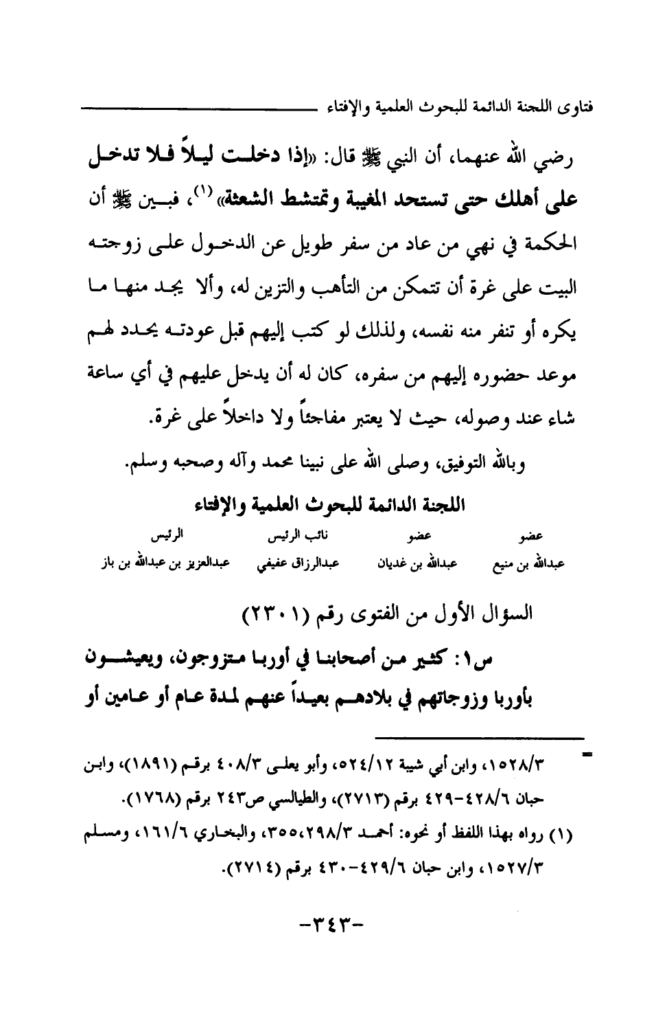 رضي الله عنهما، أن النبي صلى الله عليه وسلم قال: «إذا دخلت ليلا فلا تدخل على أهلك حتى تستحد المغيبة وتمتشط الشعثة (¬1) » فبين صلى الله عليه وسلم أن الحكمة في نهي من عاد من سفر طويل عن الدخول على زوجته البيت على غرة أن تتمكن من التأهب والتزين له، وألا يجد منها ما يكره أو تنفر منه نفسه، ولذلك لو كتب إليهم قبل عودته يحدد لهم موعد حضوره إليهم من سفره، كان له أن يدخل عليهم في أي ساعة شاء عند وصوله، حيث لا يعتبر مفاجئا ولا داخلا على غرة. وبالله التوفيق، وصلى الله على نبينا محمد وآله وصحبه وسلم.