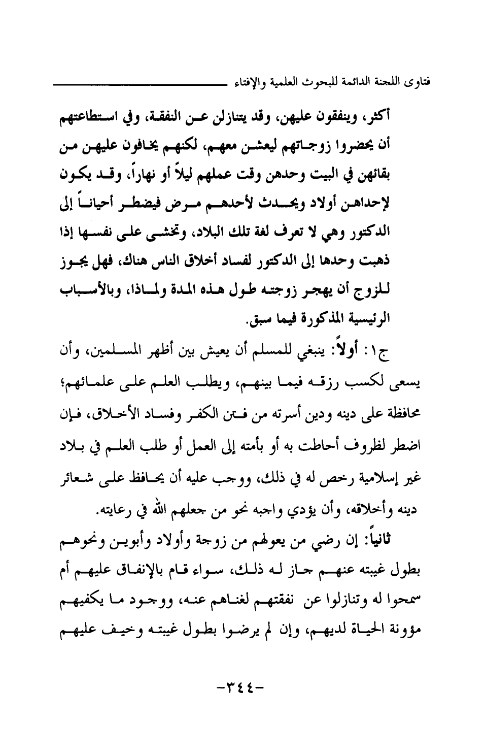 أكثر، وينفقون عليهن، وقد يتنازلن عن النفقة، وفي استطاعتهم أن يحضروا زوجاتهم ليعشن معهم، لكنهم يخافون عليهن من بقائهن في البيت وحدهن وقت عملهم ليلا أو نهارا، وقد يكون لإحداهن أولاد ويحدث لأحدهم مرض فيضطر أحيانا إلى الدكتور وهي لا تعرف لغة تلك البلاد، وتخشى على نفسها إذا ذهبت وحدها إلى الدكتور لفساد أخلاق الناس هناك، فهل يجوز للزوج أن يهجر زوجته طول هذه المدة ولماذا، وبالأسباب الرئيسية المذكورة فيما سبق.