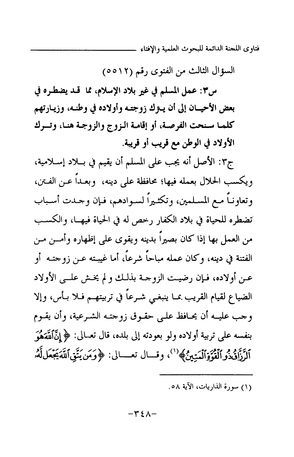 ج3: الأصل أنه يجب على المسلم أن يقيم في بلاد إسلامية، ويكسب الحلال بعمله فيها؛ محافظة على دينه، وبعدا عن الفتن، وتعاونا مع المسلمين، وتكثيرا لسوادهم، فإن وجدت أسباب تضطره للحياة في بلاد الكفار رخص له في الحياة فيها، والكسب من العمل بها إذا كان بصيرا بدينه ويقوى على إظهاره وأمن من الفتنة في دينه، وكان عمله مباحا شرعا، أما غيبته عن زوجته أو عن أولاده، فإن رضيت الزوجة بذلك ولم يخش على الأولاد الضياع لقيام القريب بما ينبغي شرعا في تربيتهم فلا بأس، وإلا وجب عليه أن يحافظ على حقوق زوجته الشرعية، وأن يقوم بنفسه على تربية أولاده ولو بعودته إلى بلده، قال تعالى: {إِنَّ اللَّهَ هُوَ الرَّزَّاقُ ذُو الْقُوَّةِ الْمَتِينُ} (¬1) وقال تعالى: {وَمَنْ يَتَّقِ اللَّهَ يَجْعَلْ لَهُ مَخْرَجًا} (¬2) {وَيَرْزُقْهُ مِنْ حَيْثُ لَا يَحْتَسِبُ وَمَنْ يَتَوَكَّلْ عَلَى اللَّهِ فَهُوَ حَسْبُهُ إِنَّ اللَّهَ بَالِغُ أَمْرِهِ قَدْ جَعَلَ اللَّهُ لِكُلِّ شَيْءٍ قَدْرًا} (¬3)
