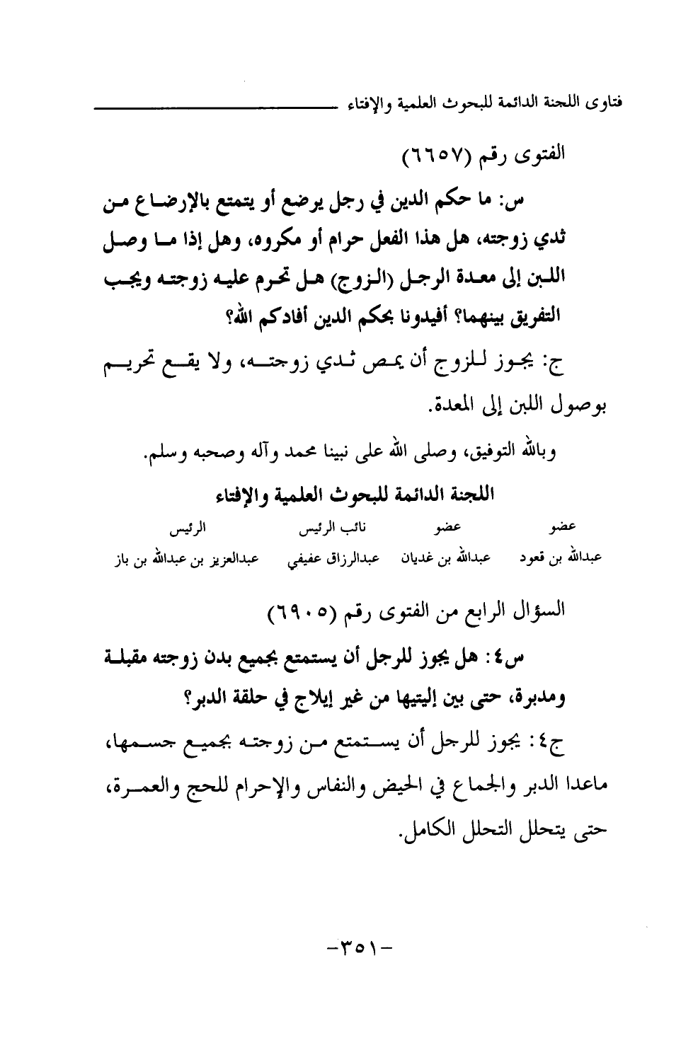 ج: يجوز للزوج أن يمص ثدي زوجته، ولا يقع تحريم بوصول اللبن إلى المعدة. وبالله التوفيق، وصلى الله على نبينا محمد وآله وصحبه وسلم.