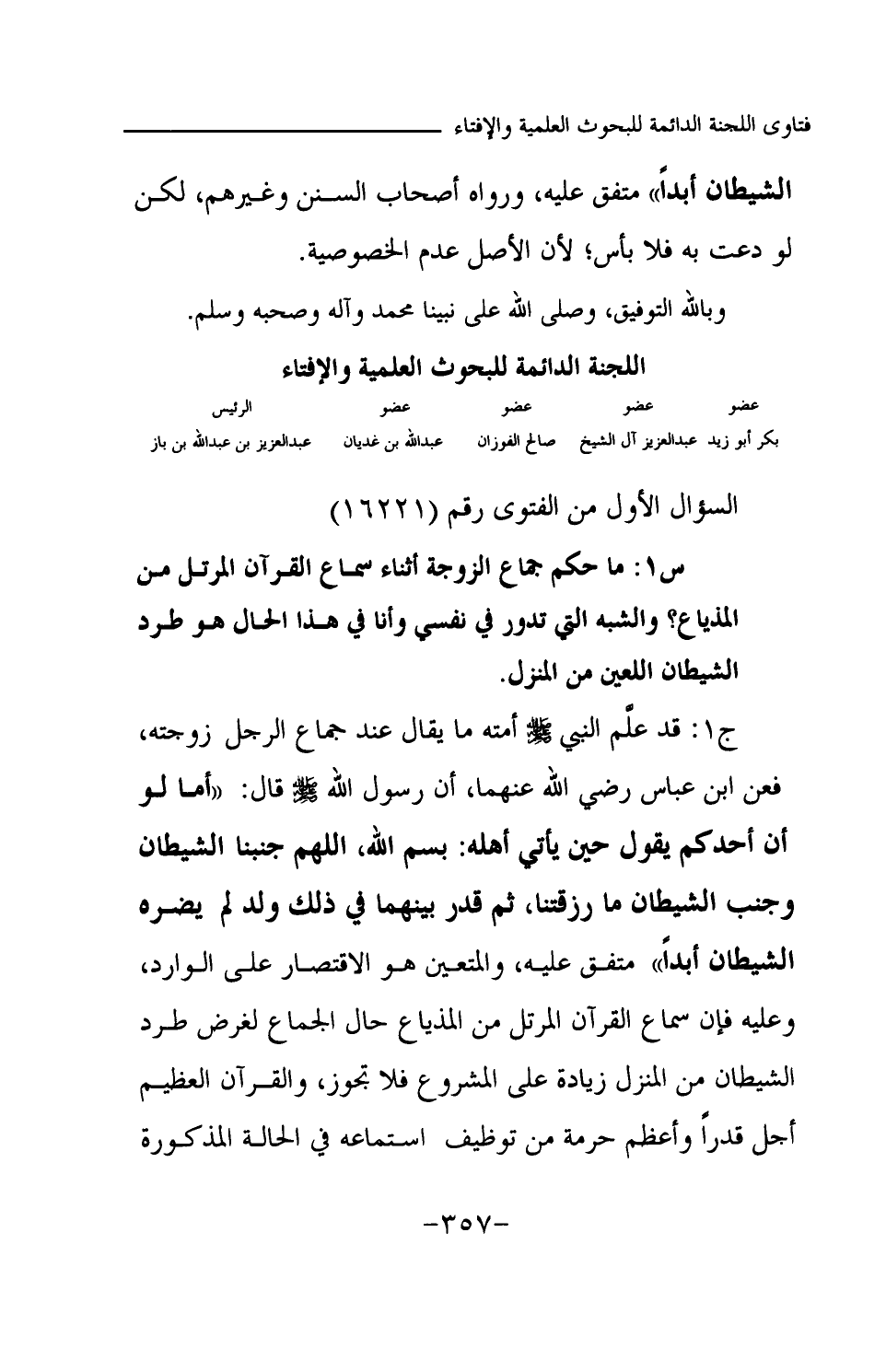 ج1: قد علم النبي صلى الله عليه وسلم أمته ما يقال عند جماع الرجل زوجته، فعن ابن عباس رضي الله عنهما، أن رسول الله صلى الله عليه وسلم قال: «أما لو أن أحدكم يقول حين يأتي أهله: بسم الله، اللهم جنبنا الشيطان وجنب الشيطان ما رزقتنا، ثم قدر بينهما في ذلك ولد لم يضره الشيطان أبدا (¬1) » متفق عليه والمتعين هو الاقتصار على الوارد، وعليه فإن سماع القرآن المرتل من المذياع حال الجماع لغرض طرد الشيطان من المنزل زيادة على المشروع فلا تجوز، والقرآن العظيم أجل قدرا وأعظم حرمة من توظيف استماعه في الحالة المذكورة