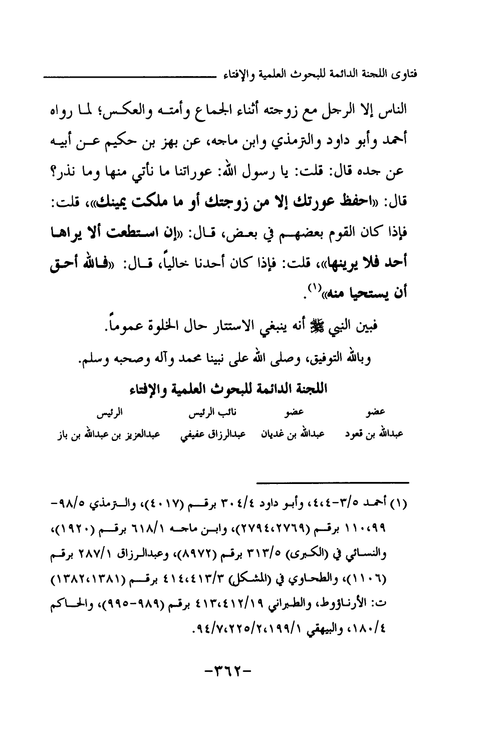 الناس إلا الرجل مع زوجته أثناء الجماع وأمته والعكس؛ لما رواه أحمد وأبو داود والترمذي وابن ماجه عن بهز بن حكيم عن أبيه عن جده قال: «قلت: يا رسول الله: عوراتنا ما نأتي منها وما نذر؟ قال: "احفظ عورتك إلا من زوجتك أو ما ملكت يمينك"، قلت: فإذا كان القوم بعضهم في بعض، قال: "إن استطعت ألا يراها أحد فلا يرينها"، قلت: فإذا كان أحدنا خاليا، قال: "فالله أحق أن يستحيا منه (¬1) » فبين النبي صلى الله عليه وسلم أنه ينبغي الاستتار حال الخلوة عموما. وبالله التوفيق، وصلى الله على نبينا محمد وآله وصحبه وسلم.
