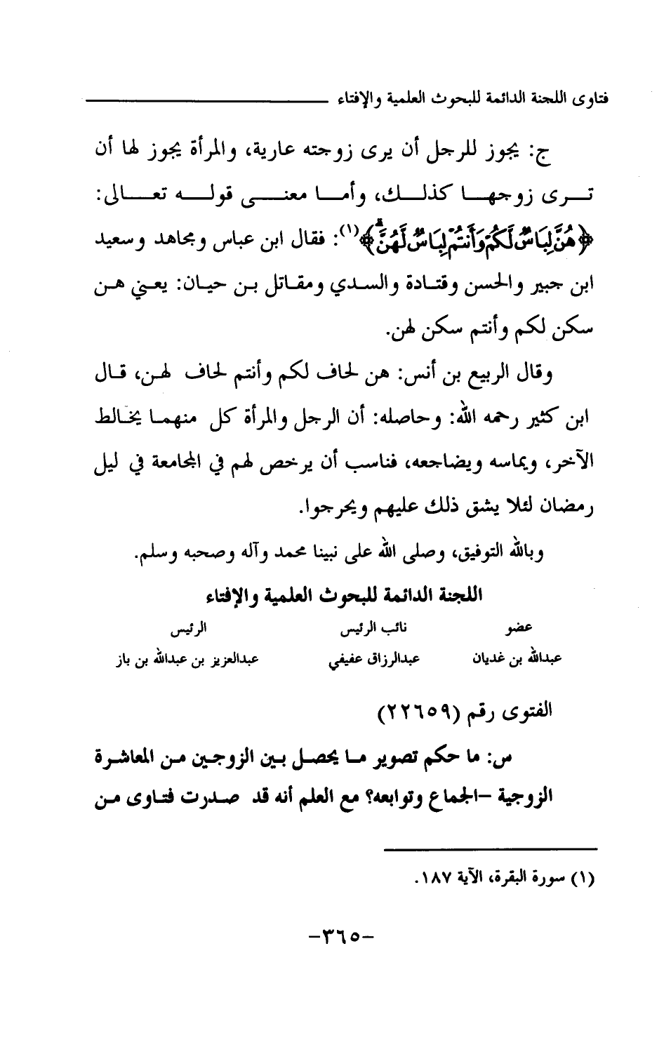 ج: يجوز للرجل أن يرى زوجته عارية، والمرأة يجوز لها أن ترى زوجها كذلك، وأما معنى قوله تعالى: {هُنَّ لِبَاسٌ لَكُمْ وَأَنْتُمْ لِبَاسٌ لَهُنَّ} (¬1) فقال ابن عباس ومجاهد وسعيد بن جبير والحسن وقتادة والسدي ومقاتل بن حيان يعني: هن سكن لكم وأنتم سكن لهن. وقال الربيع بن أنس هن لحاف لكم وأنتم لحاف لهن. قال ابن كثير رحمه الله: وحاصله: أن الرجل والمرأة كل منهما يخالط الآخر، ويماسه ويضاجعه، فناسب أن يرخص لهم في المجامعة في ليل رمضان لئلا يشق ذلك عليهم ويحرجوا. وبالله التوفيق، وصلى الله على نبينا محمد وآله وصحبه وسلم.