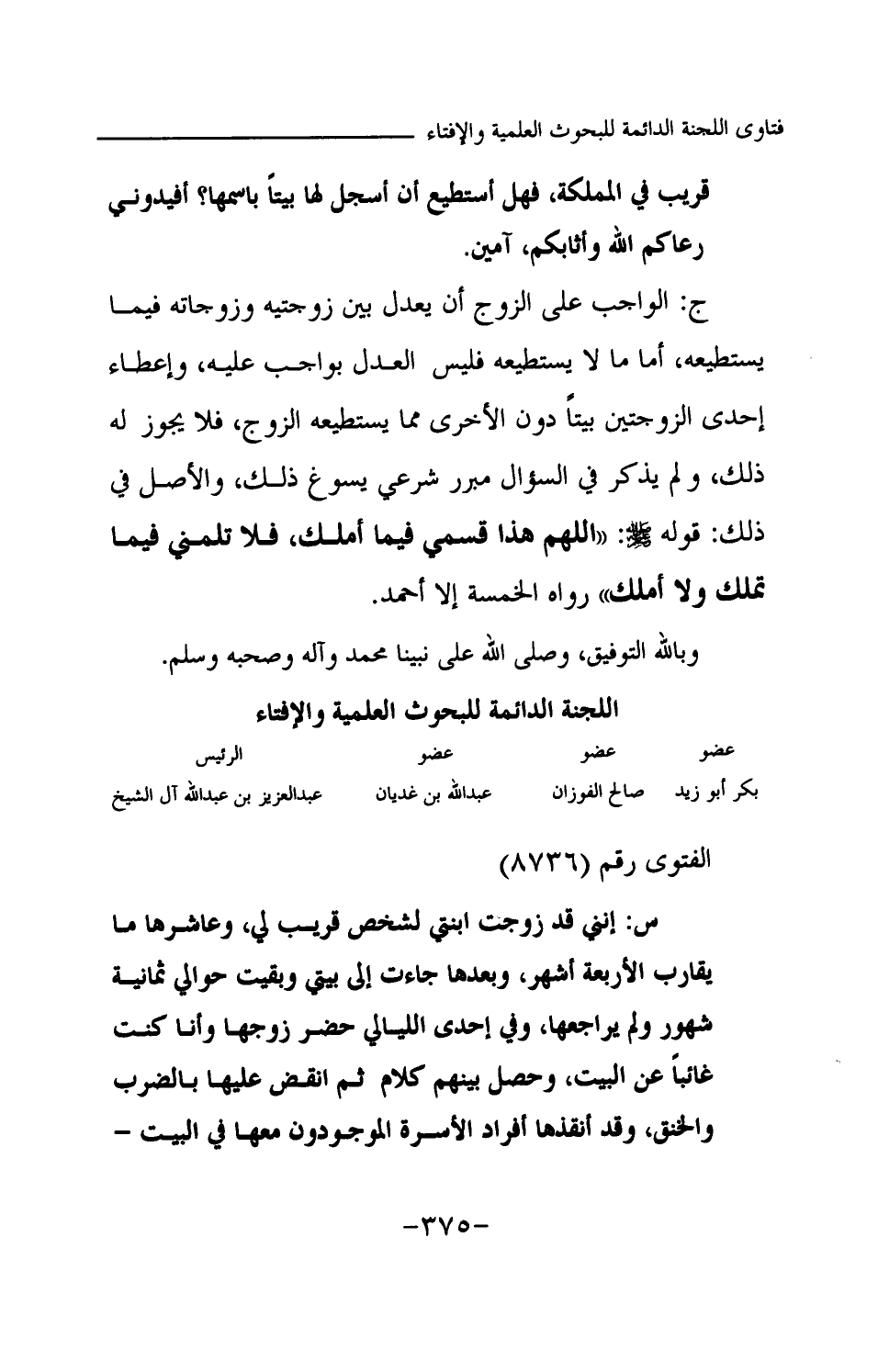 ج: الواجب على الزوج أن يعدل بين زوجتيه وزوجاته فيما يستطيعه، أما ما لا يستطيعه فليس العدل بواجب عليه، وإعطاء إحدى الزوجتين بيتا دون الأخرى مما يستطيعه الزوج، فلا يجوز له ذلك، ولم يذكر في السؤال مبرر شرعي يسوغ ذلك، والأصل في ذلك: قوله -صلى الله عليه وسلم-: «اللهم هذا قسمي فيما أملك، فلا تلمني فيما تملك ولا أملك (¬1) » رواه الخمسة إلا أحمد. وبالله التوفيق، وصلى الله على نبينا محمد وآله وصحبه وسلم.