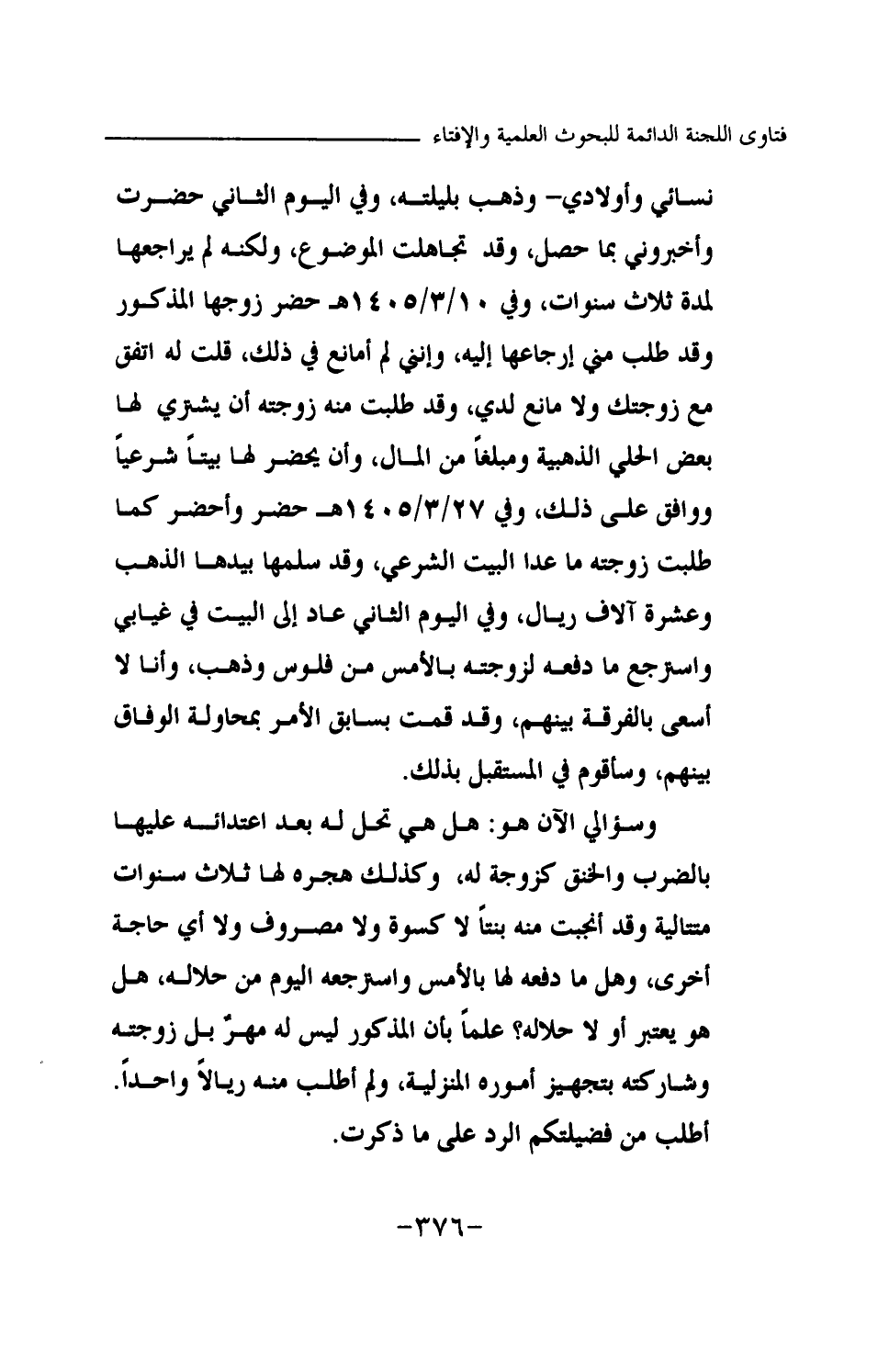 -نسائي وأولادي- وذهب بليلته، وفي اليوم الثاني حضرت وأخبروني بما حصل، وقد تجاهلت الموضوع، ولكنه لم يراجعها لمدة ثلاث سنوات، وفي 10 \ 3 \ 1405هـ حضر زوجها المذكور وقد طلب مني إرجاعها إليه، وإنني لم أمانع في ذلك، قلت له اتفق مع زوجتك ولا مانع لدي، وقد طلبت منه زوجته أن يشتري لها بعض الحلي الذهبية ومبلغا من المال، وأن يحضر لها بيتا شرعيا، ووافق على ذلك، وفي 27 \ 3 \ 1405 هـ حضر وأحضر كما طلبت زوجته ما عدا البيت الشرعي، وقد سلمها بيدها الذهب وعشرة آلاف ريال، وفي اليوم الثاني عاد إلى البيت في غيابي واسترجع ما دفعه لزوجته بالأمس من فلوس وذهب، وأنا لا أسعى بالفرقة بينهم، وقد قمت بسابق الأمر بمحاولة الوفاق بينهم، وسأقوم في المستقبل بذلك.