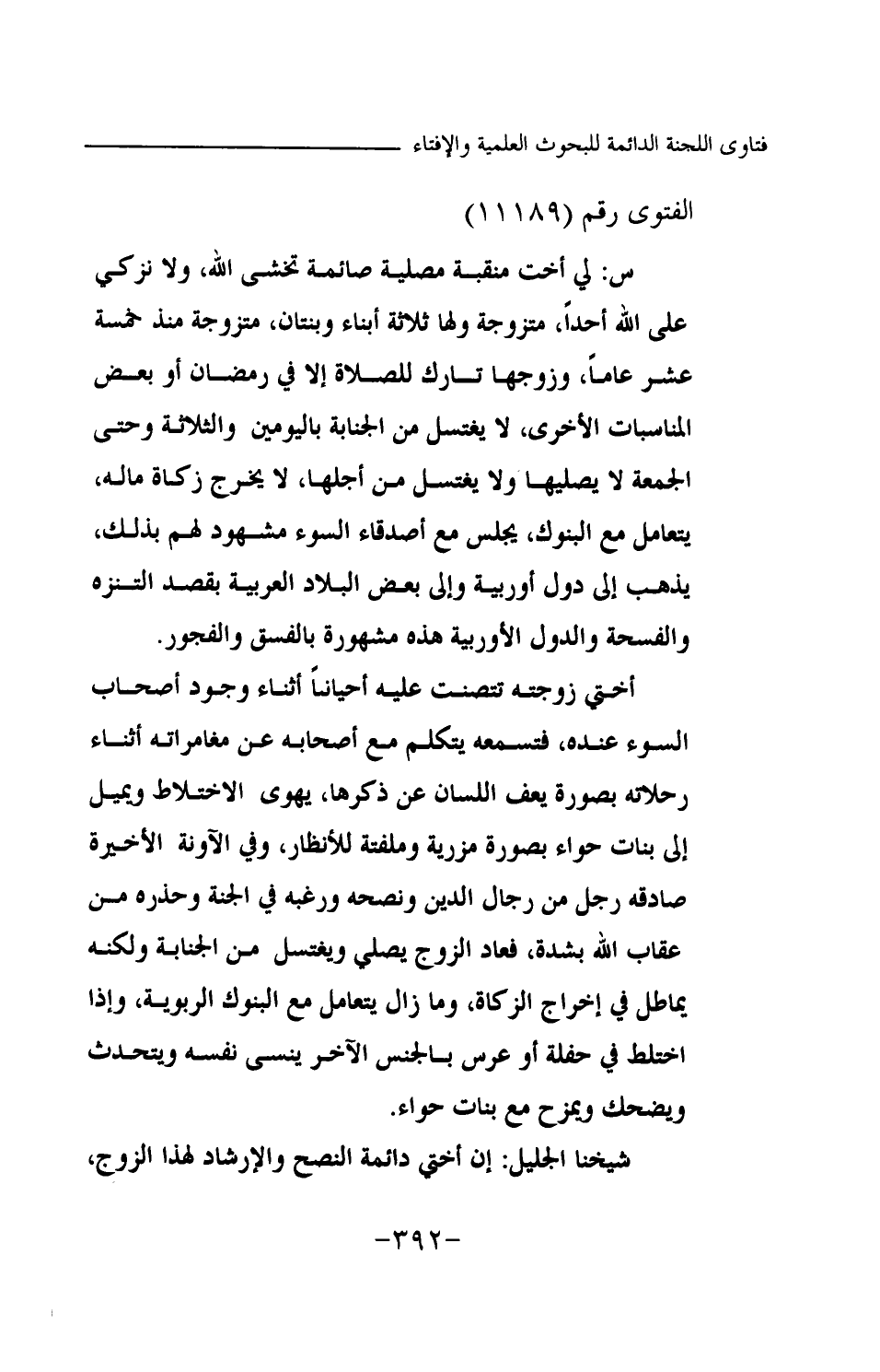س: لي أخت منتقبة مصلية صائمة تخشى الله، ولا نزكي على الله أحدا، متزوجة ولها ثلاثة أبناء وبنتان، متزوجة منذ خمسة عشر عاما، وزوجها تارك للصلاة إلا في رمضان أو بعض المناسبات الأخرى، لا يغتسل من الجنابة باليومين والثلاثة وحتى الجمعة لا يصليها ولا يغتسل من أجلها، لا يخرج زكاة ماله، يتعامل مع البنوك، يجلس مع أصدقاء السوء مشهود لهم بذلك، يذهب إلى دول أوربية وإلى بعض البلاد العربية بقصد التنزه والفسحة والدول الأوربية هذه مشهورة بالفسق والفجور. أختي زوجته تتنصت عليه أحيانا أثناء وجود أصحاب السوء عنده، فتسمعه يتكلم مع أصحابه عن مغامراته أثناء رحلاته بصورة يعف اللسان عن ذكرها، يهوى الاختلاط ويميل إلى بنات حواء بصورة مزرية وملفتة للأنظار، وفي الآونة الأخيرة صادقه رجل من رجال الدين ونصحه ورغبه في الجنة وحذره من عقاب الله بشدة، فعاد الزوج يصلي ويغتسل من الجنابة ولكنه يماطل في إخراج الزكاة، وما زال يتعامل مع البنوك الربوية، وإذا اختلط في حفلة أو عرس بالجنس الآخر ينسى نفسه ويتحدث ويضحك ويمزح مع بنات حواء. شيخنا الجليل، إن أختي دائمة النصح والإرشاد لهذا الزوج،