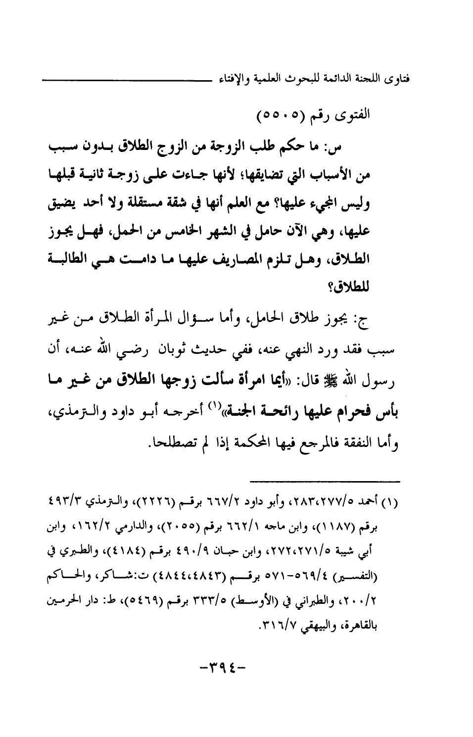 ج: يجوز طلاق الحامل، وأما سؤال المرأة الطلاق من غير سبب، فقد ورد النهي عنه، ففي حديث ثوبان رضي الله عنه، أن رسول الله -صلى الله عليه وسلم- قال: «أيما امرأة سألت زوجها الطلاق من غير ما بأس فحرام عليها رائحة الجنة (¬1) » أخرجه أبو داود والترمذي وأما النفقة فالمرجع فيها المحكمة إذا لم تصطلحا.