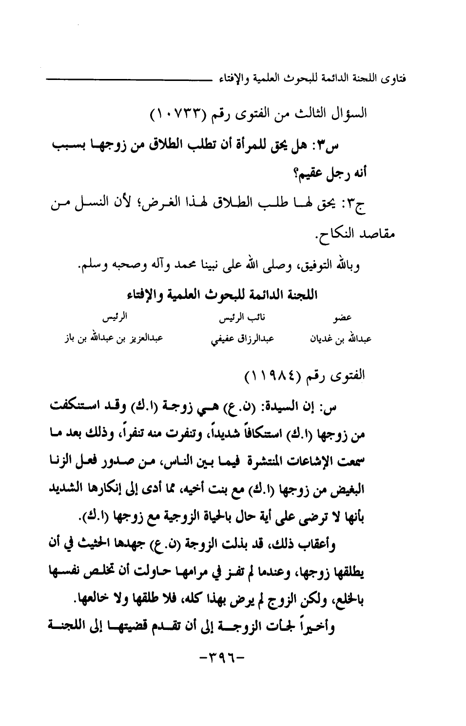 س: إن السيدة: (ن. ع) هي زوجة (ا. ك) وقد استنكفت من زوجها (ا. ك) استنكافا شديدا، وتنفرت منه تنفرا، وذلك بعدما سمعت الإشاعات المنتشرة فيما بين الناس، من صدور فعل الزنا البغيض من زوجها (ا. ك) مع بنت أخيه، مما أدى إلى إنكارها الشديد بأنها لا ترضى على أية حال بالحياة الزوجية مع زوجها (ا. ك) . وأعقاب ذلك قد بذلت الزوجة (ن. ع) جهدها الحثيث في أن يطلقها زوجها، وعندما لم تفز في مرامها حاولت أن تخلص نفسها بالخلع، ولكن الزوج لم يرض بهذا كله، فلا طلقها ولا خالعها. وأخيرا لجأت الزوجة إلى أن تقدم الزوجة قضيتها إلى اللجنة
