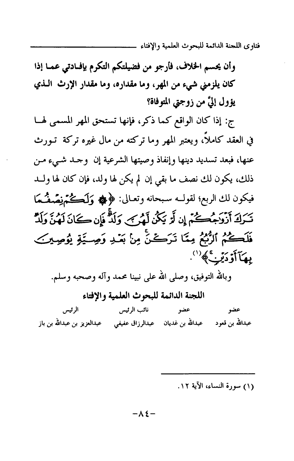 ج: إذا كان الواقع كما ذكر، فإنها تستحق المهر المسمى لها في العقد كاملا، ويعتبر المهر وما تركته من مال غيره تركة تورث عنها، فبعد تسديد دينها وإنفاذ وصيتها الشرعية إن وجد شيء من ذلك، يكون لك نصف ما بقي إن لم يكن لها ولد، فإن كان لها ولد فيكون لك الربع؛ لقوله سبحانه وتعالى: {وَلَكُمْ نِصْفُ مَا تَرَكَ أَزْوَاجُكُمْ إِنْ لَمْ يَكُنْ لَهُنَّ وَلَدٌ فَإِنْ كَانَ لَهُنَّ وَلَدٌ فَلَكُمُ الرُّبُعُ مِمَّا تَرَكْنَ مِنْ بَعْدِ وَصِيَّةٍ يُوصِينَ بِهَا أَوْ دَيْنٍ} (¬1) وبالله التوفيق، وصلى الله على نبينا محمد وآله وصحبه وسلم.