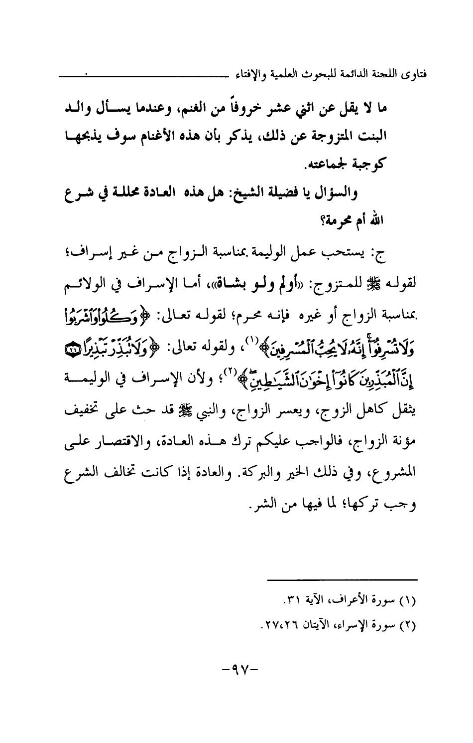 ج: يستحب عمل الوليمة بمناسبة الزواج من غير إسراف؛ لقوله -صلى الله عليه وسلم- للمتزوج: «أولم ولو بشاة (¬1) » أما الإسراف في الولائم بمناسبة الزواج أو غيره فإنه محرم؛ لقوله تعالى: {وَكُلُوا وَاشْرَبُوا وَلَا تُسْرِفُوا إِنَّهُ لَا يُحِبُّ الْمُسْرِفِينَ} (¬2) ولقوله تعالى: {وَلَا تُبَذِّرْ تَبْذِيرًا} (¬3) {إِنَّ الْمُبَذِّرِينَ كَانُوا إِخْوَانَ الشَّيَاطِينِ} (¬4) ولأن الإسراف في الوليمة يثقل كاهل الزوج، ويعسر الزواج، والنبي -صلى الله عليه وسلم- قد حث على تخفيف مؤنة الزواج، فالواجب عليكم ترك هذه العادة، والاقتصار على المشروع، وفي ذلك الخير والبركة. والعادة إذا كانت تخالف الشرع وجب تركها؛ لما فيها من الشر.