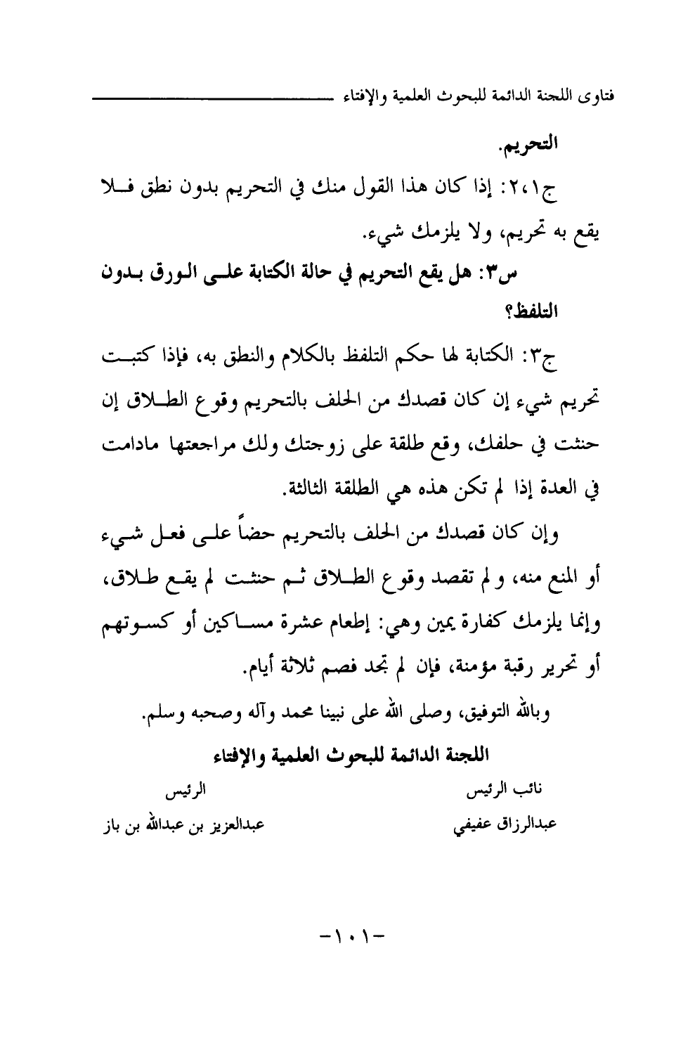 ج3: الكتابة لها حكم التلفظ بالكلام والنطق به، فإذا كتبت تحريم شيء إن كان قصدك من الحلف بالتحريم وقوع الطلاق إن حنثت في حلفك، وقع طلقة على زوجتك ولك مراجعتها ما دامت في العدة إذا لم تكن هذه هي الطلقة الثالثة. وإن كان قصدك من الحلف بالتحريم حضا على فعل شيء أو المنع منه، ولم تقصد وقوع الطلاق ثم حنثت لم يقع طلاق، وإنما يلزمك كفارة يمين وهي: إطعام عشرة مساكين أو كسوتهم أو تحرير رقبة مؤمنة، فإن لم تجد فصم ثلاثة أيام. وبالله التوفيق، وصلى الله على نبينا محمد وآله وصحبه وسلم.