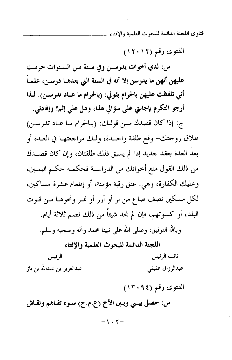 ج: إذا كان قصدك من قولك: (بالحرام ما عاد تدرسن) طلاق زوجتك- وقع طلقة واحدة، ولك مراجعتها في العدة أو بعد العدة بعقد جديد إذا لم يسبق ذلك طلقتان، وإن كان قصدك من ذلك القول منع أخواتك من الدراسة فحكمه حكم اليمين، وعليك الكفارة، وهي: عتق رقبة مؤمنة، أو إطعام عشرة مساكين، لكل مسكين نصف صاع من بر أو أرز أو تمر ونحوها من قوت البلد، أو كسوتهم، فإن لم تجد شيئا من ذلك فصم ثلاثة أيام. وبالله التوفيق، وصلى الله على نبينا محمد وآله وصحبه وسلم.