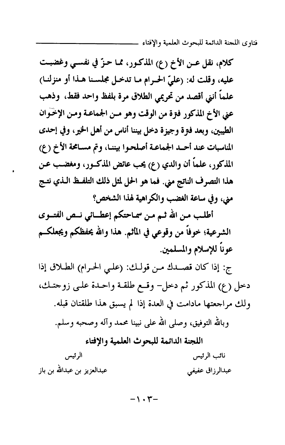 كلام، نقل عن الأخ (ع) المذكور، مما حز في نفسي وغضبت عليه، وقلت له: (علي الحرام ما تدخل مجلسنا هذا أو منزلنا) علما أنني أقصد من تحريمي الطلاق مرة بلفظ واحد فقط، وذهب عني الأخ المذكور فترة من الوقت وهو من الجماعة ومن الإخوان الطيبين، وبعد فترة وجيزة دخل بيننا أناس من أهل الخير، وفي إحدى المناسبات عند أحد الجماعة أصلحوا بيننا، وتم مسامحة الأخ (ع) المذكور، علما أن والدي (ع) يحب عائض المذكور، ومغضب عن هذا التصرف الناتج مني. فما هو الحل لمثل ذلك التلفظ الذي نتج مني، وفي ساعة الغضب والكراهية لهذا الشخص؟