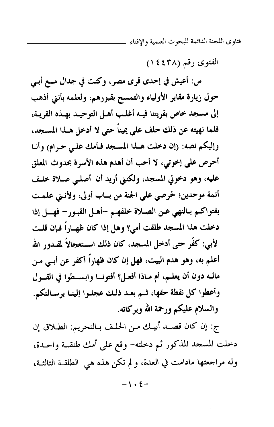 ج: إذا كان قصد أبيك من الحلف بالتحريم: الطلاق إن دخلت المسجد المذكور ثم دخلته- وقع على أمك طلقة واحدة، وله مراجعتها ما دامت في العدة، ولم تكن هذه هي الطلقة الثالثة،
