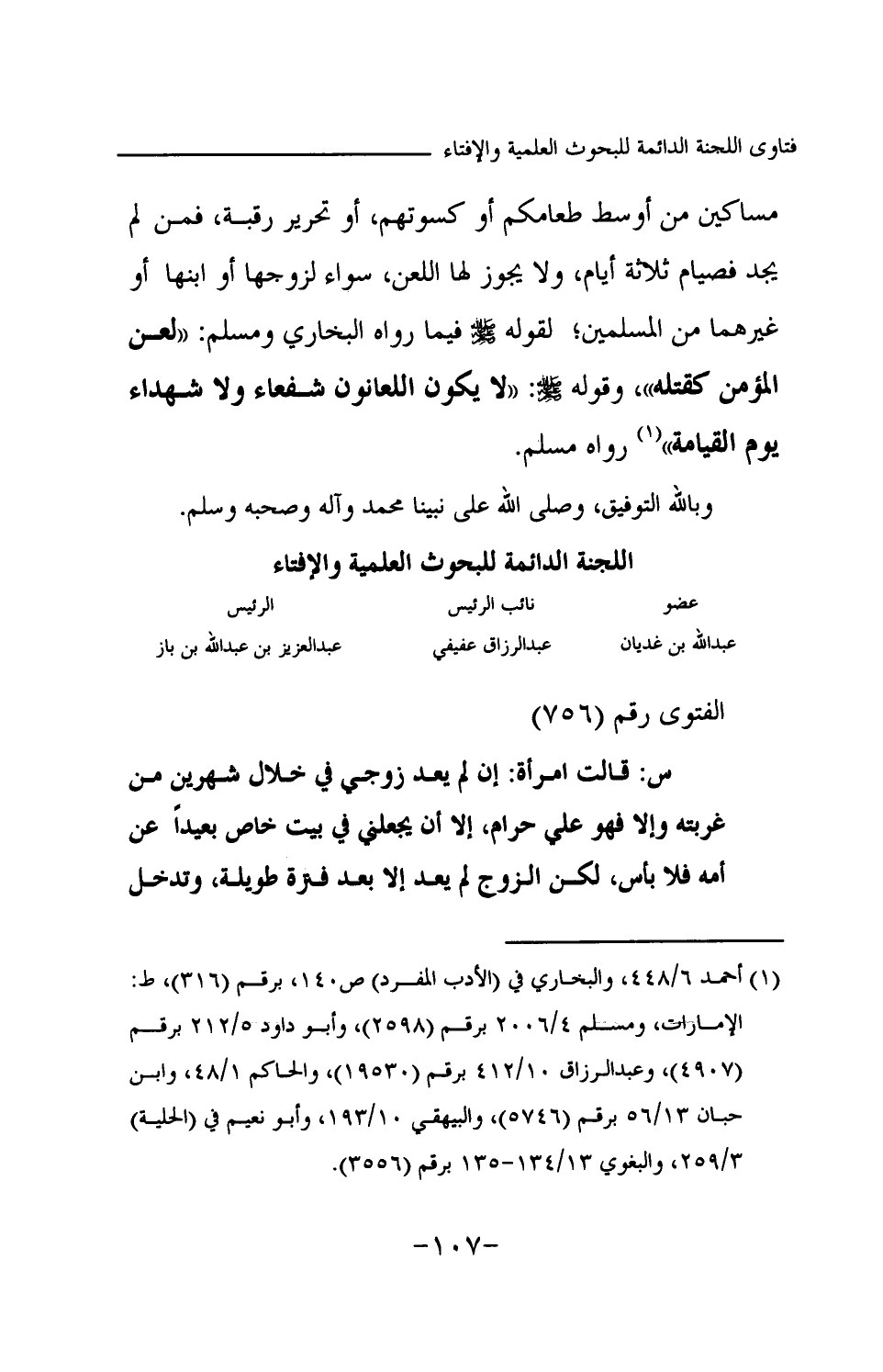 مساكين من أوسط طعامكم أو كسوتهم، أو تحرير رقبة، فمن لم يجد فصيام ثلاثة أيام، ولا يجوز لها اللعن، سواء لزوجها أو ابنها أو غيرهما من المسلمين؛ لقوله صلى الله عليه وسلم فيما رواه البخاري ومسلم «لعن المؤمن كقتله (¬1) » وقوله صلى الله عليه وسلم: «لا يكون اللعانون شفعاء ولا شهداء يوم القيامة (¬2) » رواه مسلم. وبالله التوفيق، وصلى الله على نبينا محمد وآله وصحبه وسلم.