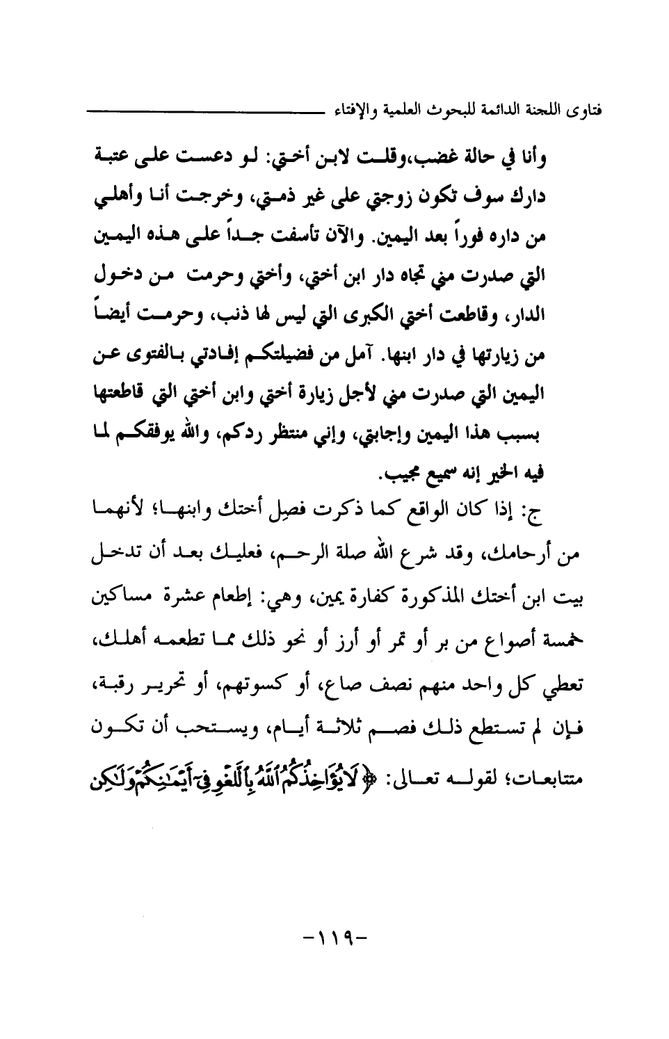 ج: إذا كان الواقع كما ذكرت فصل أختك وابنها؛ لأنهما من أرحامك، وقد شرع الله صلة الرحم، فعليك بعد أن تدخل بيت ابن أختك المذكورة كفارة يمين، وهي: إطعام عشرة مساكين خمسة أصواع من بر أو تمر أو أرز أو نحو ذلك مما تطعمه أهلك، تعطي كل واحد منهم نصف صاع، أو كسوتهم، أو تحرير رقبة، فإن لم تستطع ذلك فصم ثلاثة أيام، ويستحب أن تكون متتابعات؛ لقوله تعالى: {لَا يُؤَاخِذُكُمُ اللَّهُ بِاللَّغْوِ فِي أَيْمَانِكُمْ وَلَكِنْ يُؤَاخِذُكُمْ بِمَا عَقَّدْتُمُ الْأَيْمَانَ فَكَفَّارَتُهُ إِطْعَامُ عَشَرَةِ مَسَاكِينَ مِنْ أَوْسَطِ مَا تُطْعِمُونَ أَهْلِيكُمْ أَوْ كِسْوَتُهُمْ أَوْ تَحْرِيرُ رَقَبَةٍ فَمَنْ لَمْ يَجِدْ فَصِيَامُ ثَلَاثَةِ أَيَّامٍ ذَلِكَ كَفَّارَةُ أَيْمَانِكُمْ إِذَا حَلَفْتُمْ وَاحْفَظُوا أَيْمَانَكُمْ كَذَلِكَ يُبَيِّنُ اللَّهُ لَكُمْ آيَاتِهِ لَعَلَّكُمْ تَشْكُرُونَ} (¬1)