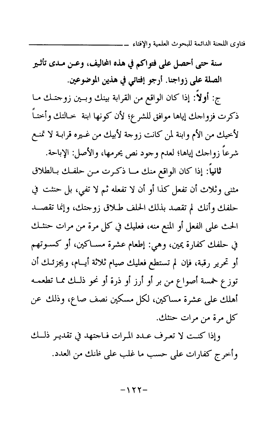 ج: أولا: إذا كان الواقع من القرابة بينك وبين زوجتك ما ذكرت فزواجك إياها موافق للشرع؛ لأن كونها ابنة خالتك وأختا لأخيك من الأم وابنة لمن كانت زوجة لأبيك من غيره قرابة لا تمنع شرعا زواجك إياها، لعدم وجود نص يحرمها، والأصل: الإباحة. ثانيا: إذا كان الواقع منك ما ذكرت من حلفك بالطلاق مثنى وثلاث أن تفعل كذا أو أن لا تفعله ثم لا تفي، بل حنثت في حلفك وأنك لم تقصد بذلك الحلف طلاق زوجتك، وإنما تقصد الحث على الفعل أو المنع منه، فعليك في كل مرة من مرات حنثك في حلفك كفارة يمين، وهي: إطعام عشرة مساكين، أو كسوتهم أو تحرير رقبة، فإن لم تستطع فعليك صيام ثلاثة أيام، ويجزئك أن توزع خمسة أصواع من بر أو أرز أو ذرة أو نحو ذلك مما تطعمه أهلك على عشرة مساكين، لكل مسكين نصف صاع، وذلك عن كل مرة من مرات حنثك. وإذا كنت لا تعرف عدد المرات فاجتهد في تقدير ذلك وأخرج كفارات على حسب ما غلب على ظنك من العدد.