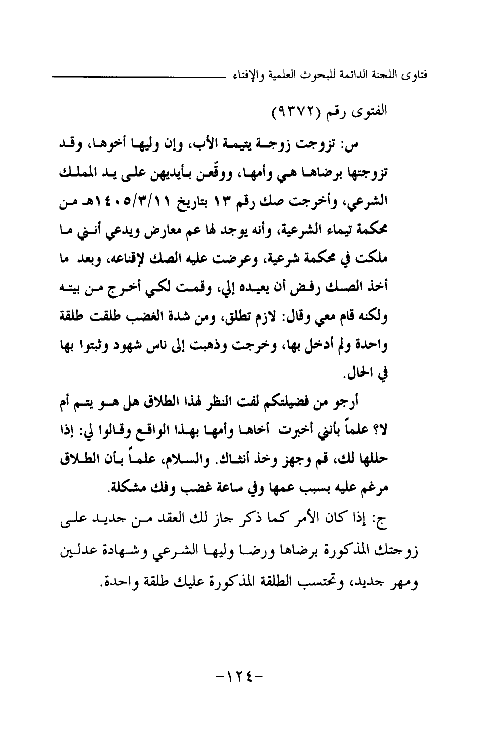 س: تزوجت زوجة يتيمة الأب، وإن وليها أخوها، وقد تزوجتها برضاها هي وأمها، ووقعن بأيديهن على يد المملك الشرعي، وأخرجت صك رقم 13 بتاريخ 11 \ 3 \ 1405 هـ من محكمة تيماء الشرعية، وأنه يوجد لها عم معارض ويدعي أنني ما ملكت في محكمة شرعية، وعرضت عليه الصك لإقناعه، وبعدما أخذ الصك رفض أن يعيده إلي، وقمت لكي أخرج من بيته ولكنه قام معي وقال: لازم تطلق، ومن شدة الغضب طلقت طلقة واحدة ولم أدخل بها، وخرجت وذهبت إلى ناس شهود وثبتوا بها في الحال.