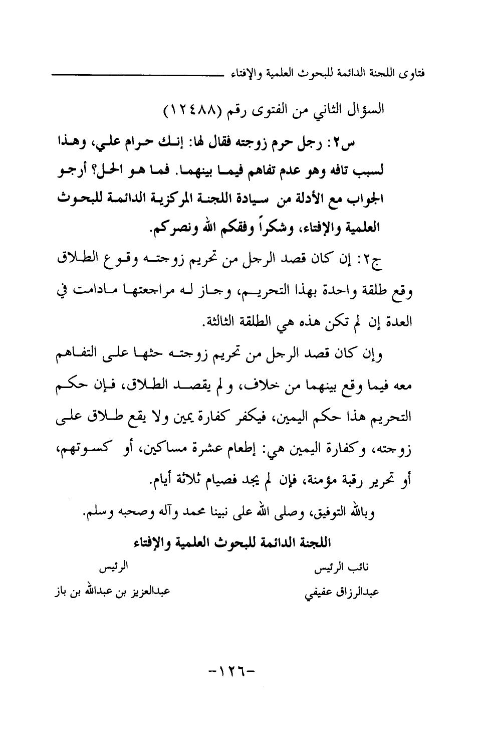 س2: رجل حرم زوجته فقال لها: إنك حرام علي، وهذا لسبب تافه وهو عدم تفاهم فيما بينهما. فما هو الحل؟ أرجو الجواب مع الأدلة من سيادة اللجنة المركزية الدائمة للبحوث العلمية والإفتاء، وشكرا وفقكم الله ونصركم.