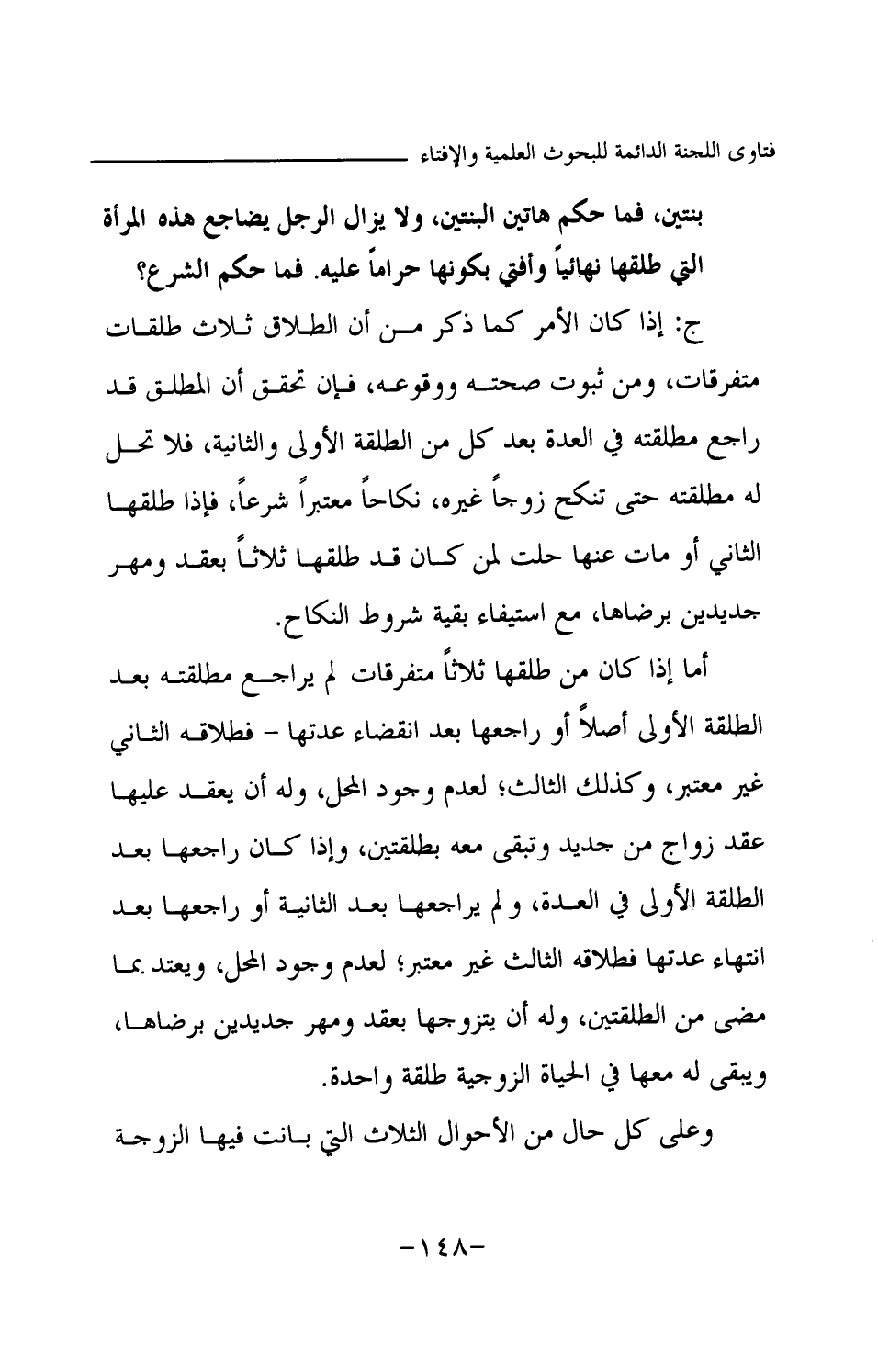 ج: إذا كان الأمر كما ذكر من أن الطلاق ثلاث طلقات متفرقات، ومن ثبوت صحته ووقوعه، فإن تحقق أن المطلق قد راجع مطلقته في العدة بعد كل من الطلقة الأولى والثانية، فلا تحل له مطلقته حتى تنكح زوجا غيره، نكاحا معتبرا شرعا، فإذا طلقها الثاني أو مات عنها حلت لمن كان قد طلقها ثلاثا بعقد ومهر جديدين برضاها، مع استيفاء بقية شروط النكاح. أما إذا كان من طلقها ثلاثا متفرقات لم يراجع مطلقته بعد الطلقة الأولى أصلا أو راجعها بعد انقضاء عدتها- فطلاقه الثاني غير معتبر، وكذلك الثالث؛ لعدم وجود المحل، وله أن يعقد عليها عقد زواج من جديد وتبقى معه بطلقتين، وإذا كان راجعها بعد الطلقة الأولى في العدة، ولم يراجعها بعد الثانية أو راجعها بعد انتهاء عدتها فطلاقه الثالث غير معتبر؛ لعدم وجود المحل، ويعتد بما مضى من الطلقتين، وله أن يتزوجها بعقد ومهر جديدين برضاها، ويبقى له معها في الحياة الزوجية طلقة واحدة. وعلى كل حال من الأحوال الثلاث التي بانت فيها الزوجة