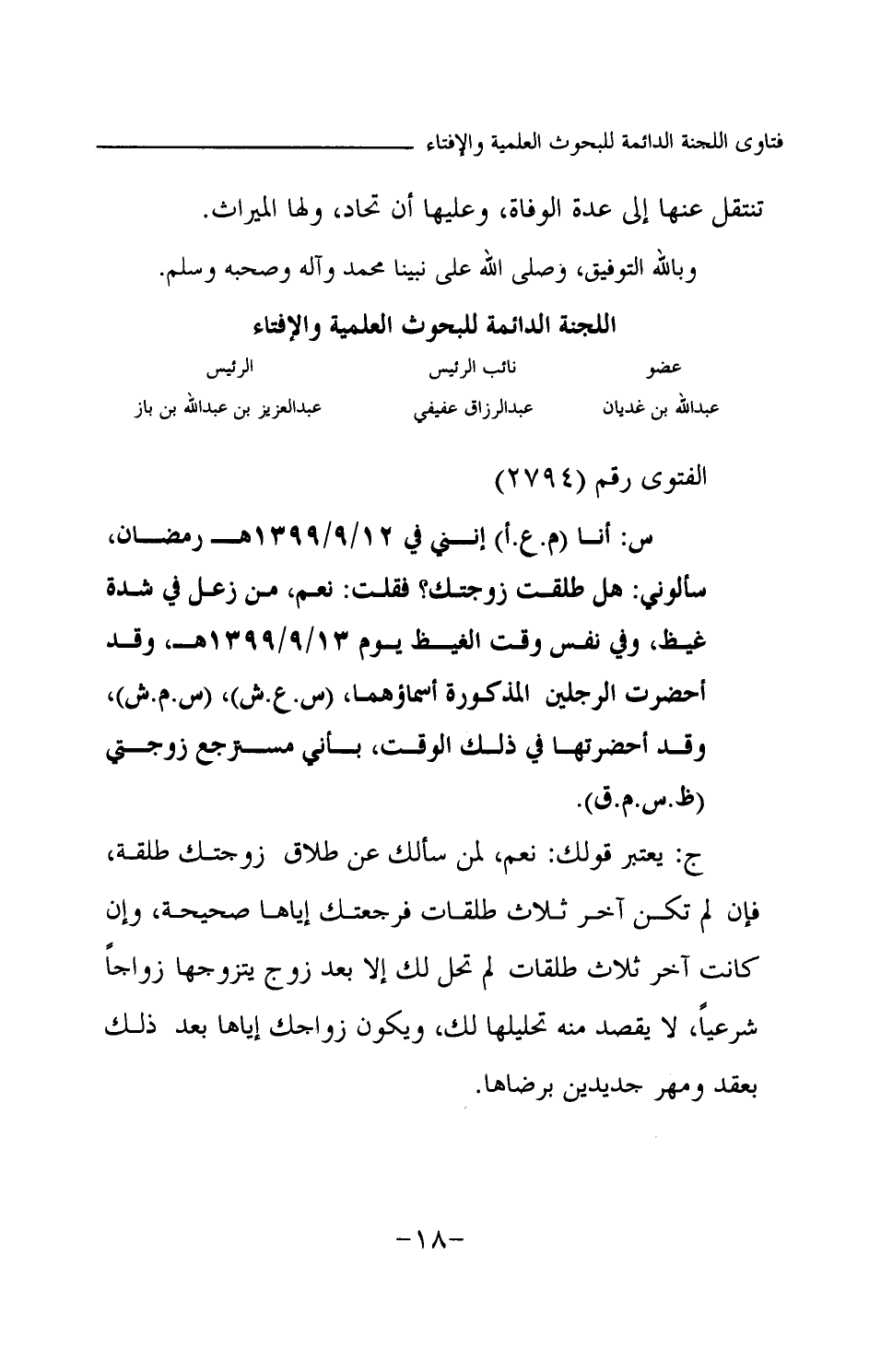 س: أنا (م. ع. أ) إنني في 12 \ 9 \ 1399هـ رمضان، سألوني: هل طلقت زوجتك؟ فقلت: نعم، من زعل في شدة غيظ، وفي نفس وقت الغيظ يوم 13 \ 9 \ 1399هـ، وقد أحضرت الرجلين المذكورة أسماؤهما، (س. ع. ش) ، (س. م. ش) ، وقد أحضرتها في ذلك الوقت، بأني مسترجع زوجتي (ظ. س. م. ق) .