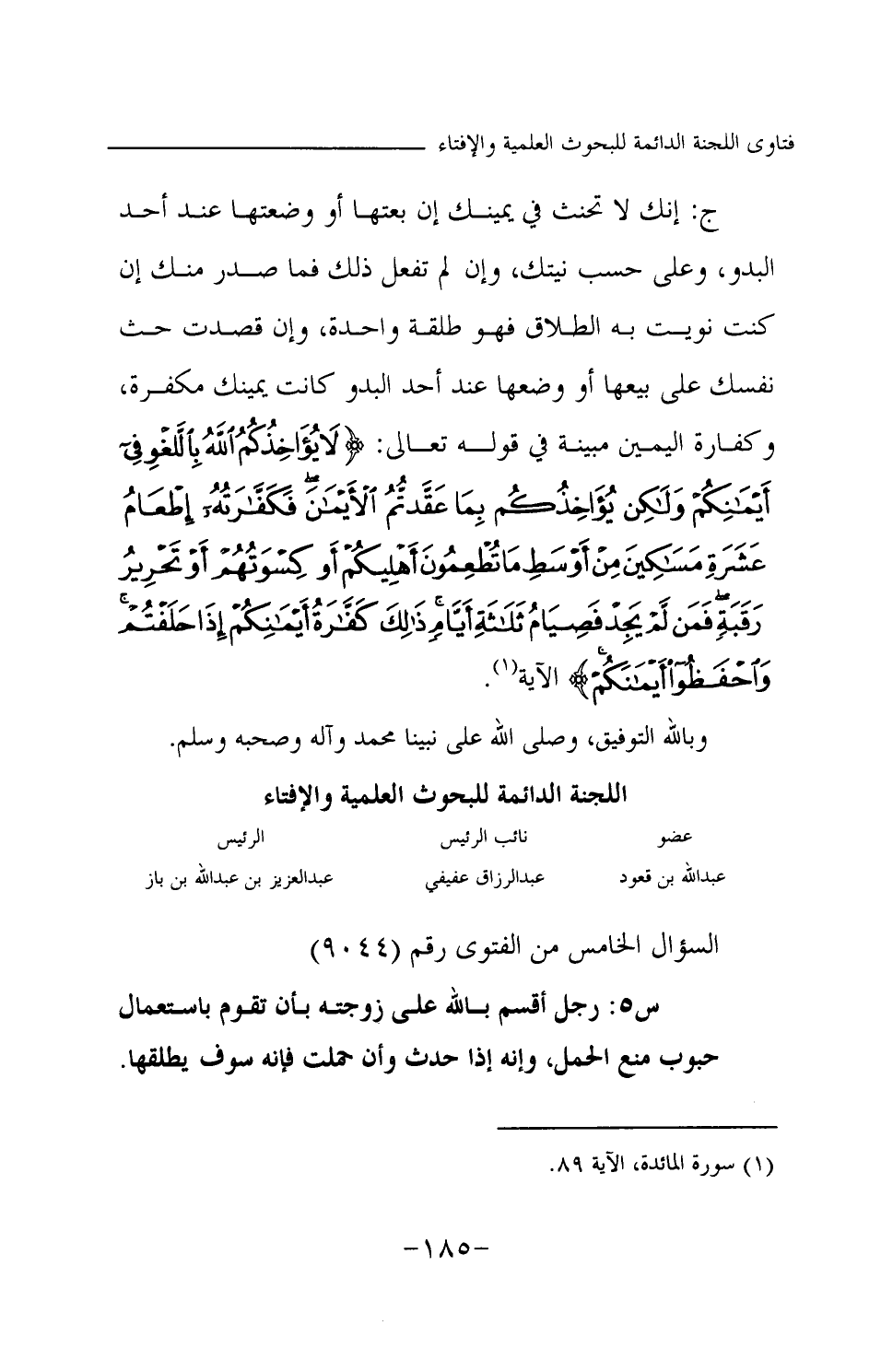 ج: إنك لا تحنث في يمينك إن بعتها أو وضعتها عند أحد البدو، وعلى حسب نيتك، وإن لم تفعل ذلك فما صدر منك إن كنت نويت به الطلاق فهو طلقة واحدة، وإن قصدت حث نفسك على بيعها أو وضعها عند أحد البدو كانت يمينك مكفرة، وكفارة اليمين مبينة في قوله تعالى: {لَا يُؤَاخِذُكُمُ اللَّهُ بِاللَّغْوِ فِي أَيْمَانِكُمْ وَلَكِنْ يُؤَاخِذُكُمْ بِمَا عَقَّدْتُمُ الْأَيْمَانَ فَكَفَّارَتُهُ إِطْعَامُ عَشَرَةِ مَسَاكِينَ مِنْ أَوْسَطِ مَا تُطْعِمُونَ أَهْلِيكُمْ أَوْ كِسْوَتُهُمْ أَوْ تَحْرِيرُ رَقَبَةٍ فَمَنْ لَمْ يَجِدْ فَصِيَامُ ثَلَاثَةِ أَيَّامٍ ذَلِكَ كَفَّارَةُ أَيْمَانِكُمْ إِذَا حَلَفْتُمْ وَاحْفَظُوا أَيْمَانَكُمْ} (¬1) الآية. وبالله التوفيق، وصلى الله على نبينا محمد الله وصحبه وسلم.