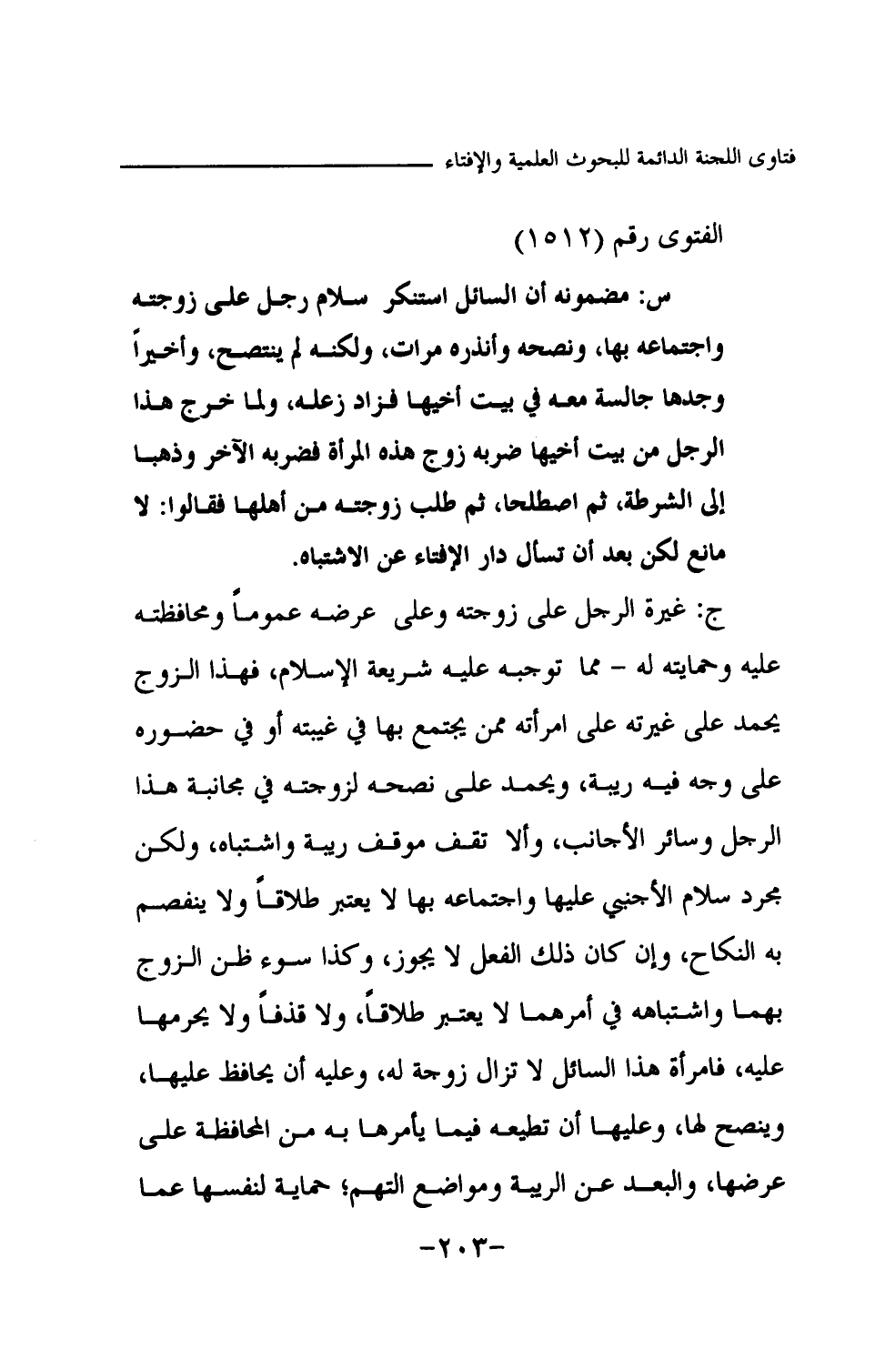 س: مضمونه أن السائل استنكر سلام رجل على زوجته واجتماعه بها، ونصحه وأنذره مرات، ولكنه لم ينتصح، وأخيرا وجدها جالسة معه في بيت أخيها فزاد زعله، ولما خرج هذا الرجل من بيت أخيها ضربه زوج هذه المرأة فضربه الآخر وذهبا إلى الشرطة، ثم اصطلحا، ثم طلب زوجته من أهلها فقالوا: لا مانع لكن بعد أن تسأل دار الإفتاء عن الاشتباه.
