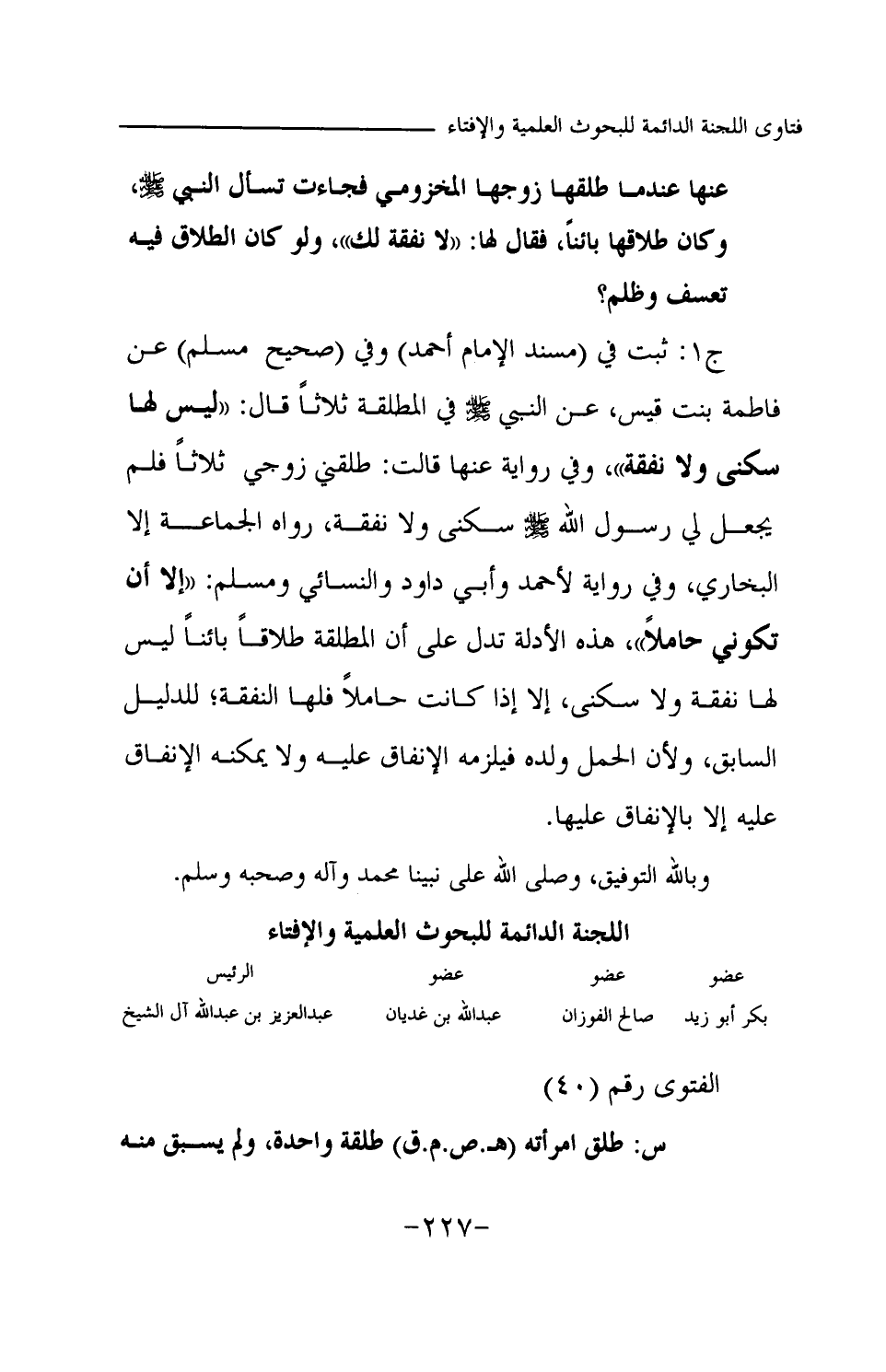 ج1: ثبت في (مسند الإمام أحمد) وفي (صحيح مسلم) عن فاطمة بنت قيس عن النبي -صلى الله عليه وسلم- في المطلقة ثلاثا قال: «ليس لها سكنى ولا نفقة (¬1) » وفي رواية عنها قالت: «طلقني زوجي ثلاثا فلم يجعل لي رسول الله -صلى الله عليه وسلم- سكنى ولا نفقة (¬2) » رواه الجماعة إلا البخاري وفي رواية لأحمد وأبي داود والنسائي ومسلم «إلا أن تكوني حاملا (¬3) » هذه الأدلة تدل على أن المطلقة طلاقا بائنا ليس لها نفقة ولا سكنى، إلا إذا كانت حاملا فلها النفقة؛ للدليل السابق، ولأن الحمل ولده فيلزمه الإنفاق عليه ولا يمكنه الإنفاق عليه إلا بالإنفاق عليها. وبالله التوفيق، وصلى الله على نبينا محمد وآله وصحبه وسلم.