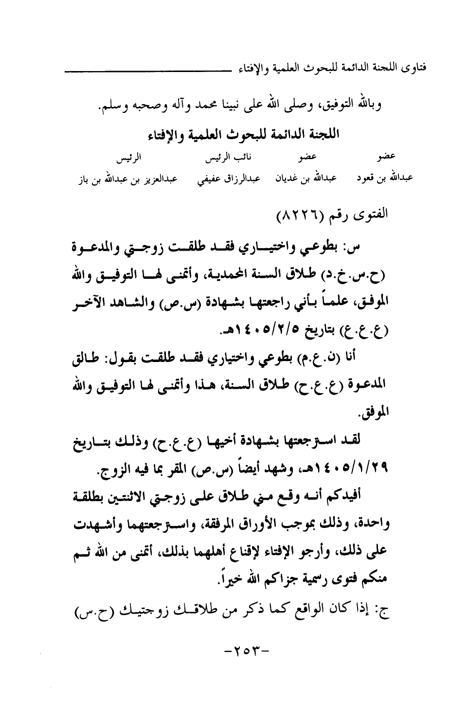 س: بطوعي واختياري فقد طلقت زوجتي والمدعوة (ح. س. خ. د) طلاق السنة المحمدية، وأتمنى لها التوفيق والله الموفق، علما بأني راجعتها بشهادة (س. ص) والشاهد الآخر (ع. ع. ع) بتاريخ 5 \ 2 \ 1405هـ.