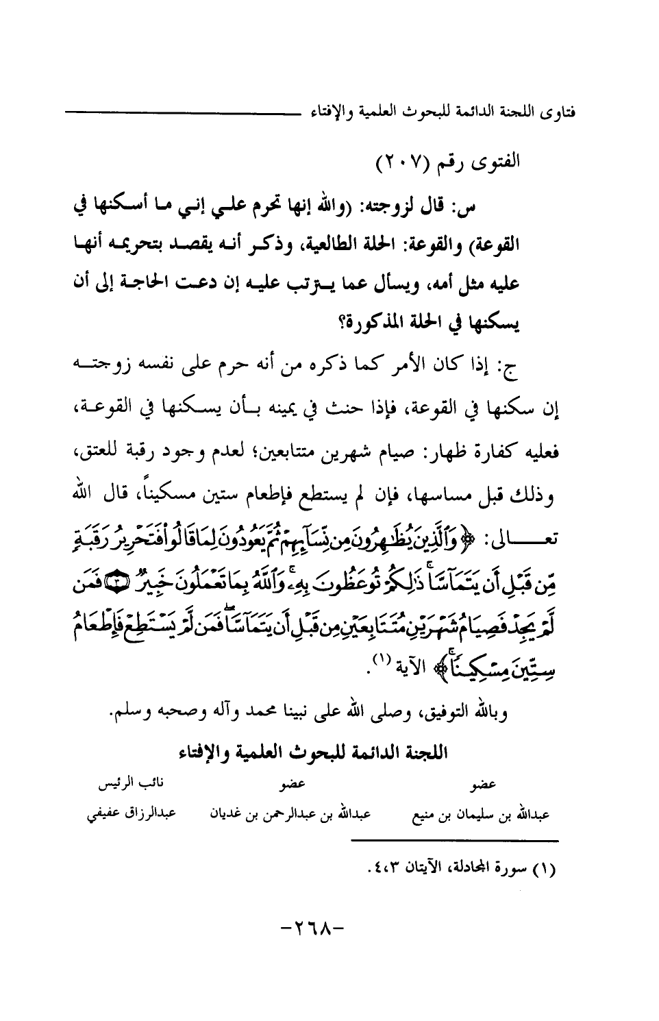 ج: إذا كان الأمر كما ذكره من أنه حرم على نفسه زوجته إن سكنها في القوعة، فإذا حنث في يمينه بأن يسكنها في القوعة، فعليه كفارة ظهار: صيام شهرين متتابعين؛ لعدم وجود رقبة للعتق، وذلك قبل مساسها، فإن لم يستطع فإطعام ستين مسكينا، قال الله تعالى: {وَالَّذِينَ يُظَاهِرُونَ مِنْ نِسَائِهِمْ ثُمَّ يَعُودُونَ لِمَا قَالُوا فَتَحْرِيرُ رَقَبَةٍ مِنْ قَبْلِ أَنْ يَتَمَاسَّا ذَلِكُمْ تُوعَظُونَ بِهِ وَاللَّهُ بِمَا تَعْمَلُونَ خَبِيرٌ} (¬1) {فَمَنْ لَمْ يَجِدْ فَصِيَامُ شَهْرَيْنِ مُتَتَابِعَيْنِ مِنْ قَبْلِ أَنْ يَتَمَاسَّا فَمَنْ لَمْ يَسْتَطِعْ فَإِطْعَامُ سِتِّينَ مِسْكِينًا} (¬2) الآية. وبالله التوفيق، وصلى الله على نبينا محمد وآله وصحبه وسلم.