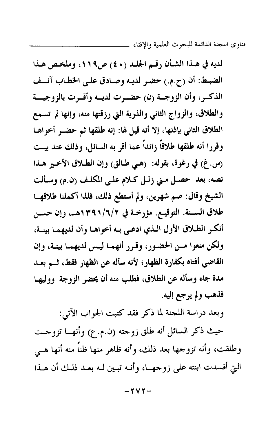 لديه في هذا الشأن رقم الجلد (40) ص 119، وملخص هذا الضبط: أن (ح. م.) حضر لديه وصادق على الخطاب آنف الذكر، وأن الزوجة (ن) حضرت لديه وأقرت بالزوجية والطلاق، والزواج الثاني والذرية التي رزقتها منه، وإنها لم تسمع الطلاق الثاني بأذنها، إلا أنه قيل لها: إنه طلقها، ثم حضر أخواها وقررا أنه طلقها طلاقا زائدا عما أقر به السائل، وذلك عند بيت (س. غ) في رغوة، بقوله: (هي طالق) وإن الطلاق الأخير هذا نصه، بعد حصل مني زلل كلام على المكلف (ن. م) وسألت الشيخ وقال: صم شهرين، ولم أستطع ذلك، فلذا أكملنا طلاقها طلاق السنة. التوقيع مؤرخة في 2 \ 6 \ 1392 هـ، وإن حسن أنكر الطلاق الأول الذي ادعى به أخواها وأن لديهما بينة، ولكن منعوا من الحضور، وقرر أنهما ليس لديهما بينة، وإن القاضي أفتاه بكفارة الظهار؛ لأنه سأله عن الظهار فقط، ثم بعد مدة جاء وسأله عن الطلاق، فطلب منه أن يحضر الزوجة ووليها فذهب ولم يرجع إليه.