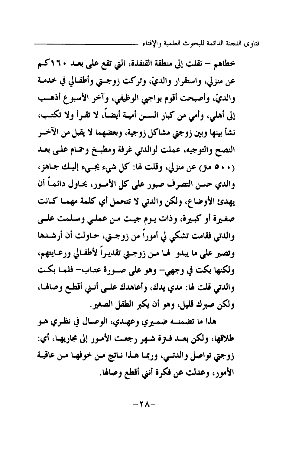 خطاهم- نقلت إلى منطقة القنفذة التي تقع على بعد 160 كم عن منزلي، واستقرار والدي، وتركت زوجتي وأطفالي في خدمة والدي، وأصبحت أقوم بواجبي الوظيفي، وآخر الأسبوع أذهب إلى أهلي، وأمي من كبار السن أمية أيضا، لا تقرأ ولا تكتب، نشأ بينها وبين زوجتي مشاكل زوجية، وبعضهما لا يقبل من الآخر النصح والتوجيه، عملت لوالدتي غرفة ومطبخا وحماما على بعد (500 متر) عن منزلي، وقلت لها: كل شيء يجيء إليك جاهز، والدي حسن التصرف صبور على كل الأمور، يحاول دائما أن يهدئ الأوضاع، ولكن والدتي لا تتحمل أي كلمة مهما كانت صغيرة أو كبيرة، وذات يوم جيت من عملي وسلمت على والدتي فقامت تشكي لي أمورا من زوجتي، حاولت أن أرشدها وتصبر على ما يبدو لها من زوجتي تقديرا لأطفالي ورعايتهم، ولكنها بكت في وجهي -وهو على صورة عتاب- فلما بكت والدتي قلت لها: مدي يدك، وأعاهدك على أنني أقطع وصالها، ولكن صبرك قليل، وهو أن يكبر الطفل الصغير.