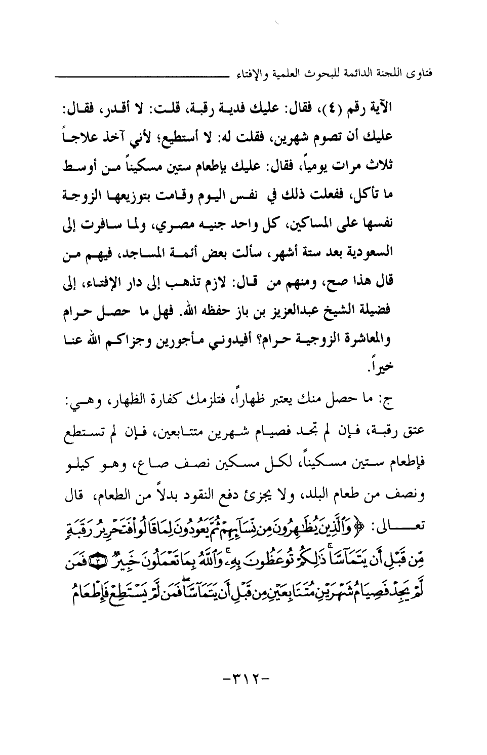 الآية رقم (4) ، فقال: عليك فدية رقبة، قلت: لا أقدر، فقال: عليك أن تصوم شهرين، فقلت له: لا أستطيع؛ لأني آخذ علاجا ثلاث مرات يوميا، فقال: عليك بإطعام ستين مسكينا من أوسط ما تأكل، ففعلت ذلك في نفس اليوم وقامت بتوزيعها الزوجة نفسها على المساكين، كل واحد جنيه مصري، ولما سافرت إلى السعودية بعد ستة أشهر، سألت بعض أئمة المساجد، فيهم من قال هذا صح، ومنهم من قال: لازم تذهب إلى دار الإفتاء، إلى فضيلة الشيخ عبد العزيز بن باز حفظه الله. فهل ما حصل حرام والمعاشرة الزوجية حرام؟ أفيدوني مأجورين وجزاكم الله عنا خيرا.