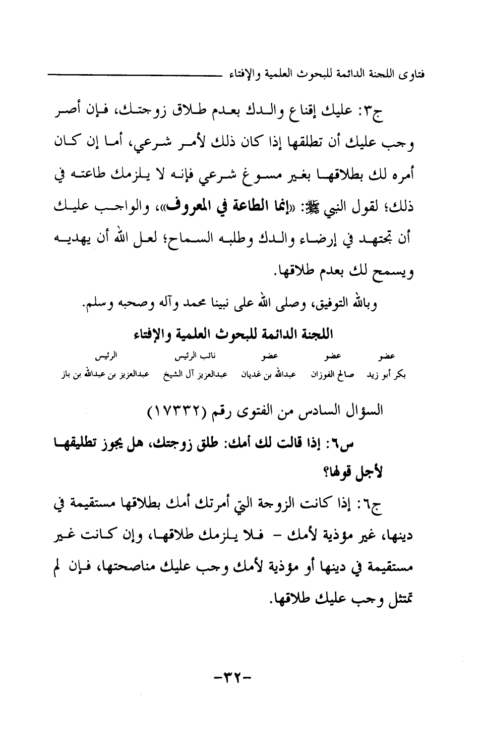 ج3: عليك إقناع والدك بعدم طلاق زوجتك، فإن أصر وجب عليك أن تطلقها إذا كان ذلك لأمر شرعي، أما إن كان أمره لك بطلاقها بغير مسوغ شرعي فإنه لا يلزمك طاعته في ذلك؛ لقول النبي -صلى الله عليه وسلم-: «إنما الطاعة في المعروف (¬1) » والواجب عليك أن تجتهد في إرضاء والدك وطلبه السماح؛ لعل الله أن يهديه ويسمح لك بعدم طلاقها. وبالله التوفيق، وصلى الله على نبينا، محمد وآله وصحبه وسلم.