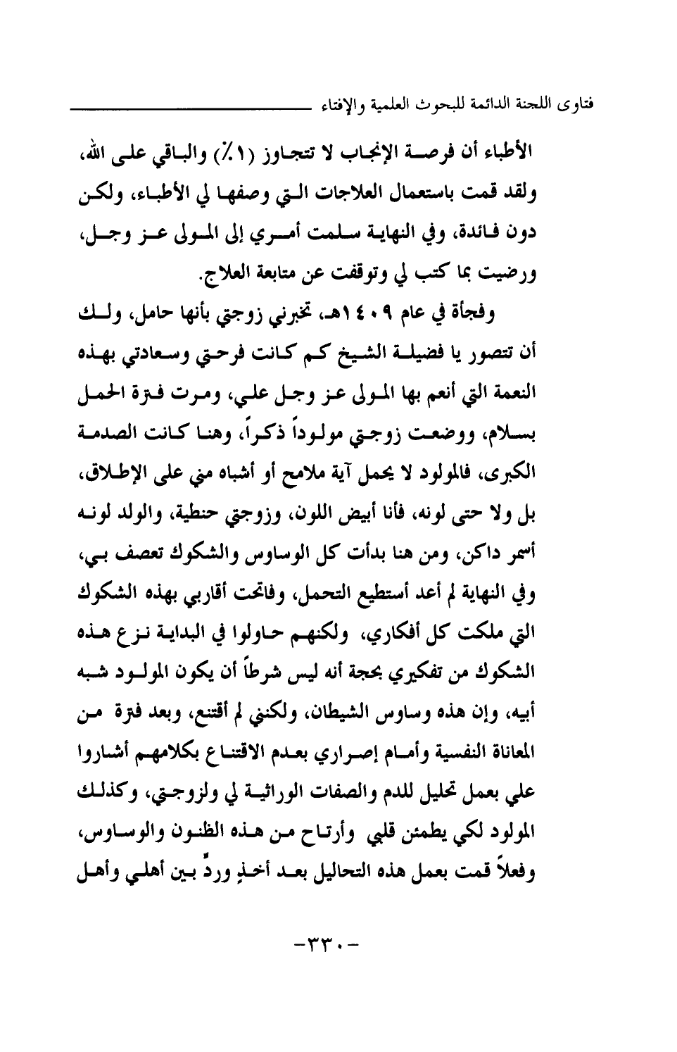 وفجأة في عام 1409 هـ، تخبرني زوجتي بأنها حامل، ولك أن تتصور يا فضيلة الشيخ كم كانت فرحتي وسعادتي بهذه النعمة التي أنعم بها المولى عز وجل علي، ومرت فترة الحمل بسلام، ووضعت زوجتي مولودا ذكرا، وهنا كانت الصدمة الكبرى، فالمولود لا يحمل أية ملامح أو أشباه مني على الإطلاق، بل ولا حتى لونه، فأنا أبيض اللون، وزوجتي حنطية، والولد لونه أسمر داكن، ومن هنا بدأت كل الوساوس والشكوك تعصف بي.