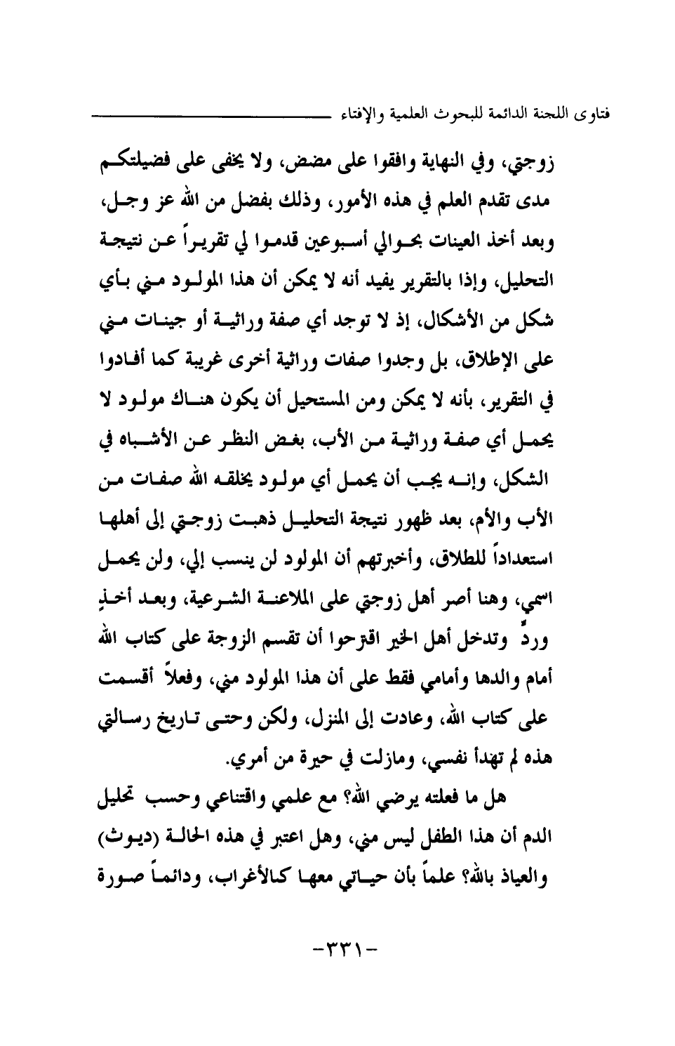 زوجتي، وفي النهاية وافقوا على مضض، ولا يخفى على فضيلتكم مدى تقدم العلم في هذه الأمور، وذلك بفضل من الله عز وجل، وبعد أخذ العينات بحوالي أسبوعين قدموا لي تقريرا عن نتيجة التحليل، وإذا بالتقرير يفيد أنه لا يمكن أن هذا المولود مني بأي شكل من الأشكال، إذ لا توجد أي صفة وراثية أو جينات مني على الإطلاق، بل وجدوا صفات وراثية أخرى غريبة كما أفادوا في التقرير، بأنه لا يمكن ومن المستحيل أن يكون هناك مولود لا يحمل أي صفة وراثية من الأب، بغض النظر عن الأشباه في الشكل، وإنه يجب أن يحمل أي مولود يخلقه الله صفات من الأب والأم.