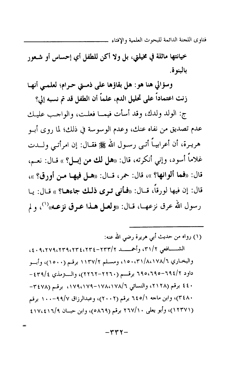 ج: الولد ولدك، وقد أسأت فيما فعلت، والواجب عليك عدم تصديق من نفاه عنك، وعدم الوسوسة في ذلك؛ لما روى أبو هريرة «أن أعرابيا أتى رسول الله -صلى الله عليه وسلم- فقال: إن امرأتي ولدت غلاما أسود، وإني أنكرته، قال: "هل لك من إبل"؟ قال: نعم، قال: "فما ألوانها؟ "، قال: حمر، قال: "هل فيها من أورق؟ "، قال: إن فيها لورقا، قال: "فأنى ترى ذلك جاءها؟ " قال: يا رسول الله عرق نزعها، قال: "ولعل هذا عرق نزعه (¬1) » ولم