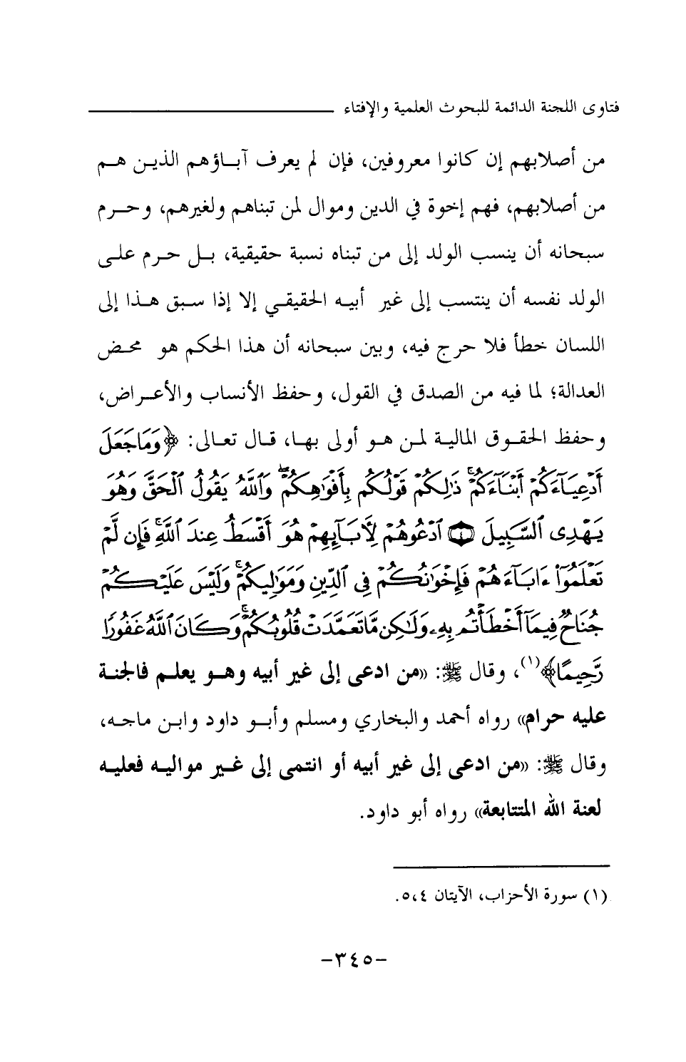من أصلابهم إن كانوا معروفين، فإن لم يعرف آباؤهم الذين هم من أصلابهم، فهم أخوة في الدين وموال لمن تبناهم ولغيرهم، وحرم سبحانه أن ينسب الولد إلى من تبناه نسبة حقيقية، بل حرم على الولد نفسه أن ينتسب إلى غير أبيه الحقيقي إلا إذا سبق هذا إلى اللسان خطأ فلا حرج فيه، وبين سبحانه أن هذا الحكم هو محض العدالة؛ لما فيه من الصدق في القول، وحفظ الأنساب والأعراض، وحفظ الحقوق المالية لمن هو أولى بها. قال تعالى: {وَمَا جَعَلَ أَدْعِيَاءَكُمْ أَبْنَاءَكُمْ ذَلِكُمْ قَوْلُكُمْ بِأَفْوَاهِكُمْ وَاللَّهُ يَقُولُ الْحَقَّ وَهُوَ يَهْدِي السَّبِيلَ} (¬1) {ادْعُوهُمْ لِآبَائِهِمْ هُوَ أَقْسَطُ عِنْدَ اللَّهِ فَإِنْ لَمْ تَعْلَمُوا آبَاءَهُمْ فَإِخْوَانُكُمْ فِي الدِّينِ وَمَوَالِيكُمْ وَلَيْسَ عَلَيْكُمْ جُنَاحٌ فِيمَا أَخْطَأْتُمْ بِهِ وَلَكِنْ مَا تَعَمَّدَتْ قُلُوبُكُمْ وَكَانَ اللَّهُ غَفُورًا رَحِيمًا} (¬2) وقال -صلى الله عليه وسلم-: «من ادعى إلى غير أبيه وهو يعلم فالجنة عليه حرام (¬3) » رواه أحمد والبخاري ومسلم وأبو داود وابن ماجه. وقال -صلى الله عليه وسلم-: «من ادعى إلى غير أبيه أو انتمى إلى غير مواليه فعليه لعنة الله المتتابعة» رواه أبو داود.