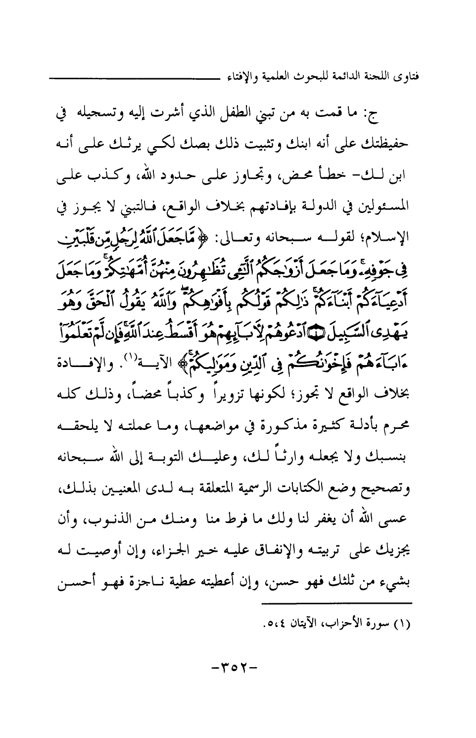 ج: ما قمت به من تبني الطفل الذي أشرت إليه وتسجيله في حفيظتك على أنه ابنك وتثبيت ذلك بصك لكي يرثك على أنه ابن لك- خطأ محض، وتجاوز على حدود الله، وكذب على المسئولين في الدولة بإفادتهم بخلاف الواقع، فالتبني لا يجوز في الإسلام؛ لقوله سبحانه وتعالى: {مَا جَعَلَ اللَّهُ لِرَجُلٍ مِنْ قَلْبَيْنِ فِي جَوْفِهِ وَمَا جَعَلَ أَزْوَاجَكُمُ اللَّائِي تُظَاهِرُونَ مِنْهُنَّ أُمَّهَاتِكُمْ وَمَا جَعَلَ أَدْعِيَاءَكُمْ أَبْنَاءَكُمْ ذَلِكُمْ قَوْلُكُمْ بِأَفْوَاهِكُمْ وَاللَّهُ يَقُولُ الْحَقَّ وَهُوَ يَهْدِي السَّبِيلَ} (¬1) {ادْعُوهُمْ لِآبَائِهِمْ هُوَ أَقْسَطُ عِنْدَ اللَّهِ فَإِنْ لَمْ تَعْلَمُوا آبَاءَهُمْ فَإِخْوَانُكُمْ فِي الدِّينِ وَمَوَالِيكُمْ} (¬2) الآية. والإفادة بخلاف الواقع لا تجوز؛ لكونها تزويرا وكذبا محضا، وذلك كله محرم بأدلة كثيرة مذكورة في مواضعها، وما عملته لا يلحقه بنسبك ولا يجعله وارثا لك، وعليك التوبة إلى الله سبحانه وتصحيح وضع الكتابات الرسمية المتعلقة به لدى المعنيين بذلك، عسى الله أن يغفر لنا ولك ما فرط منا ومنك من الذنوب، وأن يجزيك على تربيته والإنفاق عليه خير الجزاء، وإن أوصيت له بشيء من ثلثك فهو حسن، وإن أعطيته عطية ناجزة فهو أحسن