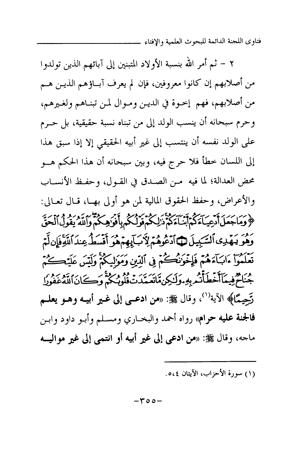 2 - ثم أمر الله بنسبة الأولاد المتبنين إلى آبائهم الذين تولدوا من أصلابهم إن كانوا معروفين، فإن لم يعرف آباؤهم الذين هم من أصلابهم، فهم أخوة في الدين وموال لمن تبناهم ولغيرهم، وحرم سبحانه أن ينسب الولد إلى من تبناه نسبة حقيقية، بل حرم على الولد نفسه أن ينتسب إلى غير أبيه الحقيقي إلا إذا سبق هذا إلى اللسان خطأ فلا حرج فيه، وبين سبحانه أن هذا الحكم هو محض العدالة؛ لما فيه من الصدق في القول، وحفظ الأنساب والأعراض، وحفظ الحقوق المالية لمن هو أولى بها. قال تعالى: {وَمَا جَعَلَ أَدْعِيَاءَكُمْ أَبْنَاءَكُمْ ذَلِكُمْ قَوْلُكُمْ بِأَفْوَاهِكُمْ وَاللَّهُ يَقُولُ الْحَقَّ وَهُوَ يَهْدِي السَّبِيلَ} (¬1) {ادْعُوهُمْ لِآبَائِهِمْ هُوَ أَقْسَطُ عِنْدَ اللَّهِ فَإِنْ لَمْ تَعْلَمُوا آبَاءَهُمْ فَإِخْوَانُكُمْ فِي الدِّينِ وَمَوَالِيكُمْ وَلَيْسَ عَلَيْكُمْ جُنَاحٌ فِيمَا أَخْطَأْتُمْ بِهِ وَلَكِنْ مَا تَعَمَّدَتْ قُلُوبُكُمْ وَكَانَ اللَّهُ غَفُورًا رَحِيمًا} (¬2) وقال -صلى الله عليه وسلم-: «من ادعى إلى غير أبيه وهو يعلم فالجنة عليه حرام (¬3) » رواه أحمد والبخاري ومسلم وأبو داود وابن ماجه. وقال -صلى الله عليه وسلم-: «من ادعى إلى غير أبيه أو انتمى إلى غير مواليه فعليه لعنة الله المتتابعة»