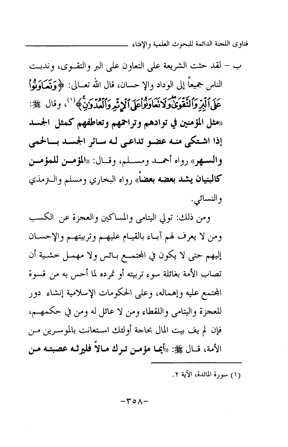 ب- لقد حثت الشريعة على التعاون على البر والتقوى، وندبت الناس جميعا إلى الوداد والإحسان، قال الله تعالى: {وَتَعَاوَنُوا عَلَى الْبِرِّ وَالتَّقْوَى وَلَا تَعَاوَنُوا عَلَى الْإِثْمِ وَالْعُدْوَانِ} (¬1) وقال -صلى الله عليه وسلم-: «مثل المؤمنين في توادهم وتراحمهم وتعاطفهم كمثل الجسد إذا اشتكى منه عضو تداعى له سائر الجسد بالحمى والسهر (¬2) » رواه أحمد ومسلم. وقال: «المؤمن للمؤمن كالبنيان يشد بعضه بعضا (¬3) » رواه البخاري ومسلم والترمذي والنسائي. ومن ذلك: تولي اليتامى والمساكين والعجزة عن الكسب ومن لا يعرف لهم آباء بالقيام عليهم وتربيتهم والإحسان إليهم حتى لا يكون في المجتمع بائس ولا مهمل خشية أن تصاب الأمة بغائلة سوء تربيته أو تمرده لما أحس به من قسوة المجتمع عليه وإهماله، وعلى الحكومات الإسلامية إنشاء دور للعجزة واليتامى واللقطاء ومن لا عائل له ومن في حكمهم، فإن لم يف بيت المال بحاجة أولئك استعانت بالموسرين من الأمة، قال -صلى الله عليه وسلم-: «أيما مؤمن ترك مالا فليرثه عصبته من كانوا، ومن ترك دينا أو ضياعا فليأتني فأنا مولاه (¬4) »
